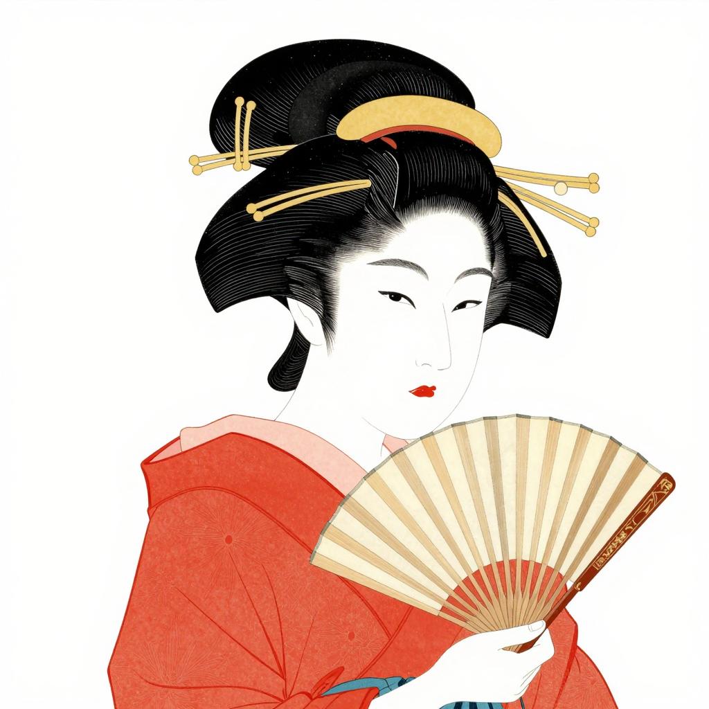 An exquisite illustration of Japanese geisha fan, crafted in traditional ukiyo-e print style with crimson and ivory highlights, set against a vast white negative space, UHD, 16K, ultra-detailed.