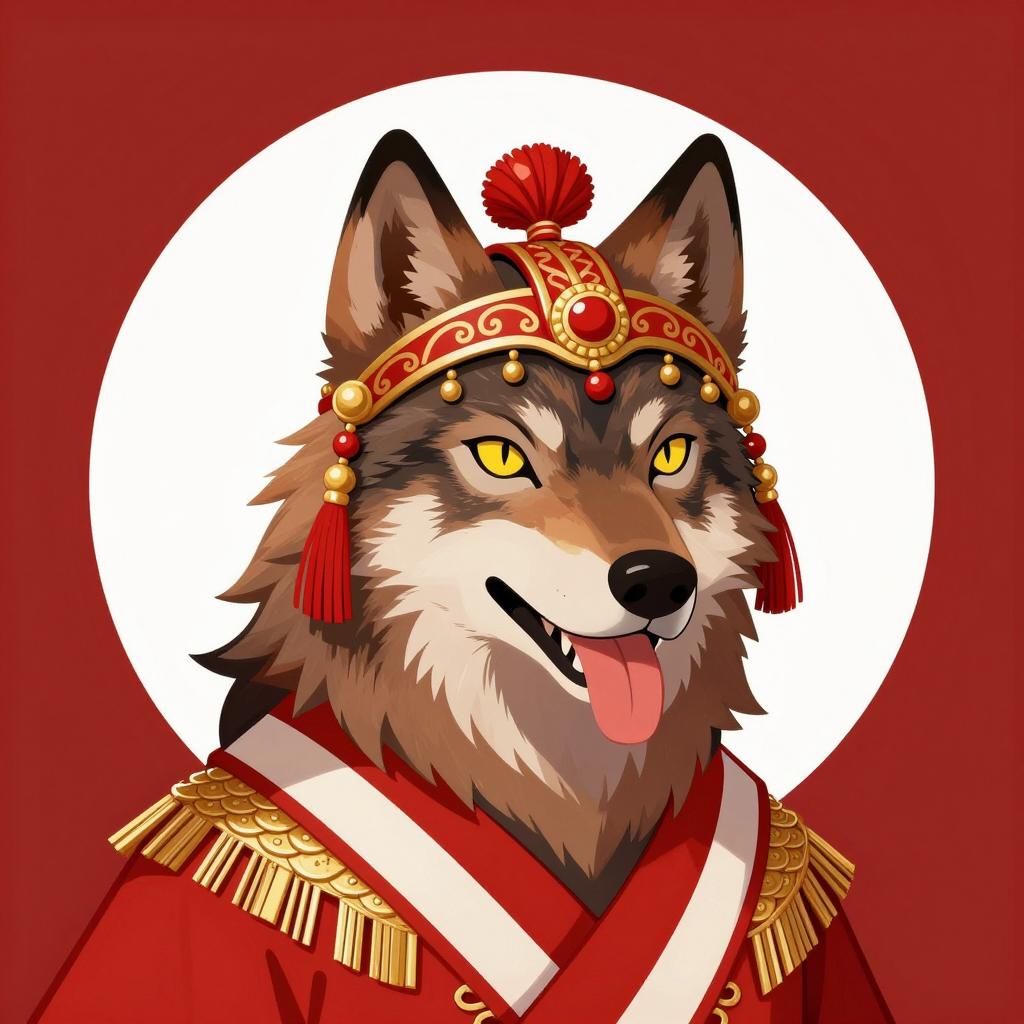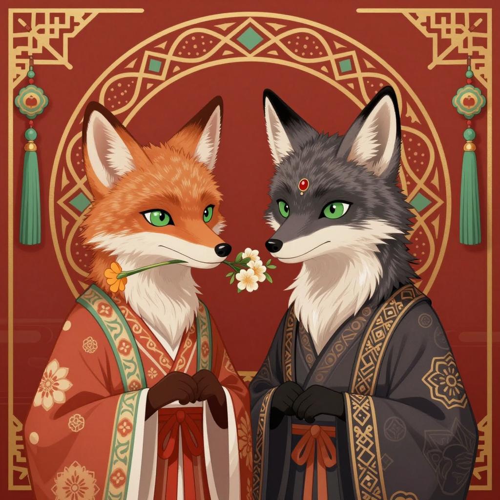 Illustration of two anthropomorphic foxes wearing traditional, patterned robes with intricate floral and geometric designs. The fox on the left has light brown fur, green eyes, and holds a yellow flower in its mouth, dressed in a red and green robe. The fox on the right has black and white fur, green eyes, wearing a dark blue robe with gold accents and a red gem on its forehead. They are positioned against a red background with detailed gold and green ornamental patterns, flanked by tasseled ornaments.