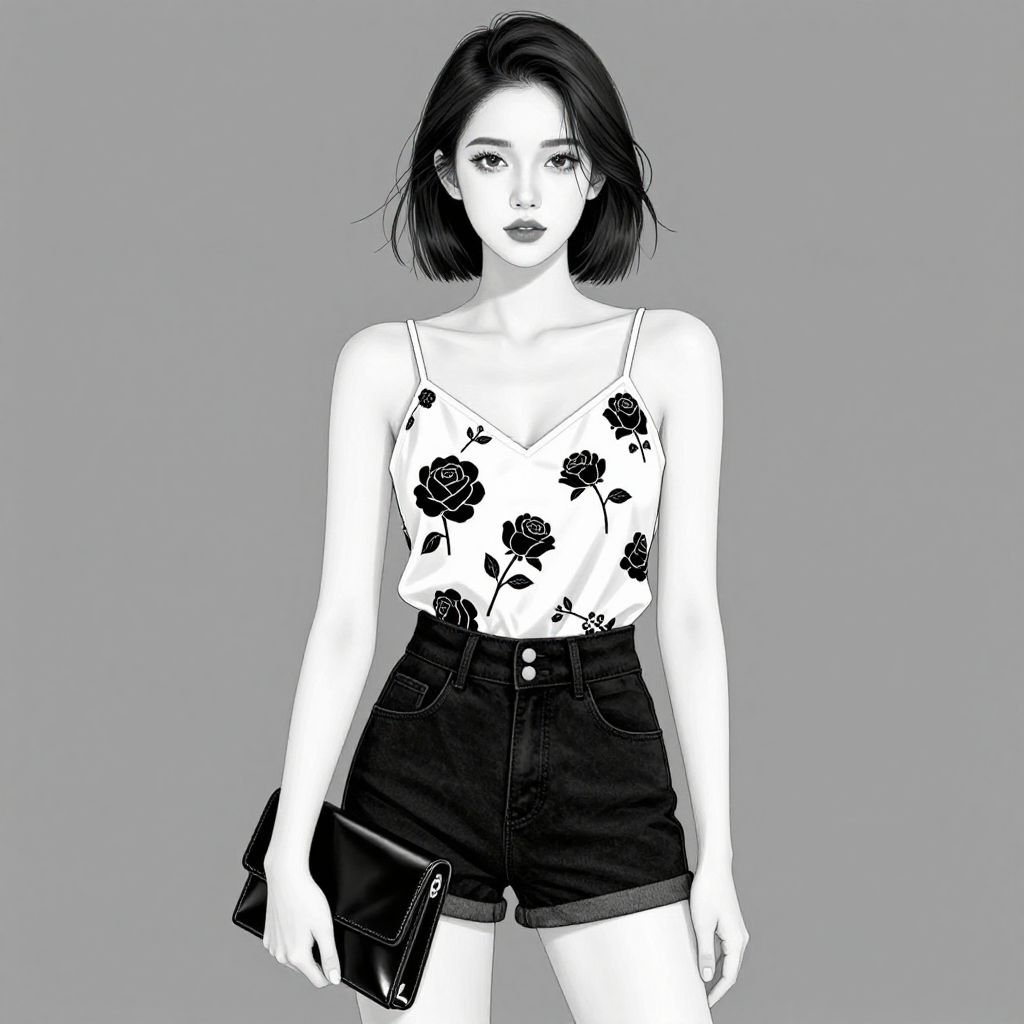 Monochromatic illustration of a young woman with short dark hair wearing a sleeveless white v-neck camisole featuring black rose prints, tucked into high-waisted black denim shorts. The outfit is complemented by a slim black clutch with a glossy finish held in one hand. The woman has a realistic face, a confident upright posture, and a casual yet fashionable look.