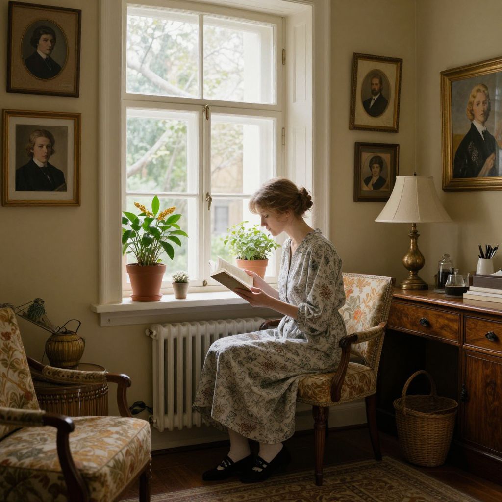 Woman reading by a window in a warmly lit interior, surrounded by vintage furnishings, framed portraits, and potted plants, evoking the style of Carl Larsson.