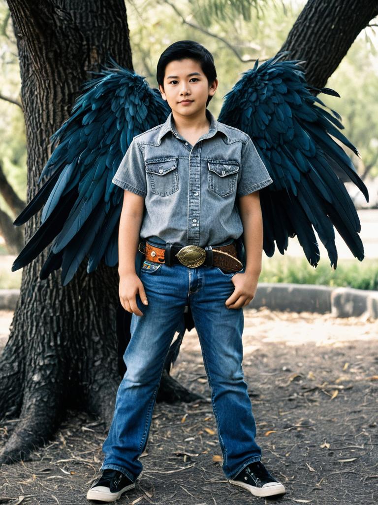 Parrot wings costume, 1boy, male focus, solo, wings, facial hair, pants, outdoors, belt, black hair, shirt, full body, denim, tree, standing, grey shirt, feathered wings, jeans, feathers, looking at viewer