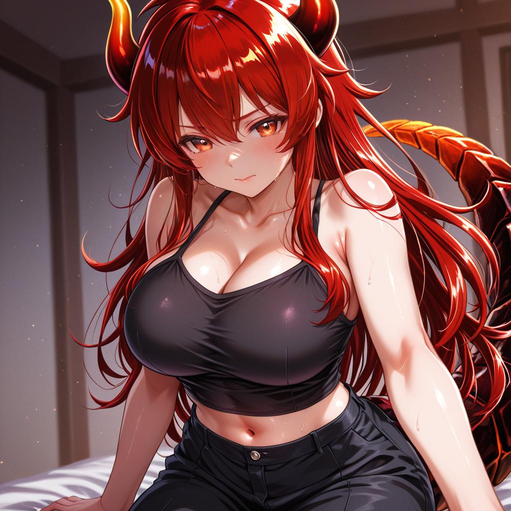 Dola (nijisanji), nijisanji, 1girl, dragon horns, dragon tail, red eyes, hair between eyes, red hair, long hair, very long hair, large breasts, huge breasts, cleavage, navel, virtual youtuber, virtual youtuber, dragon girl, by artist kuboken, dark_illustrious