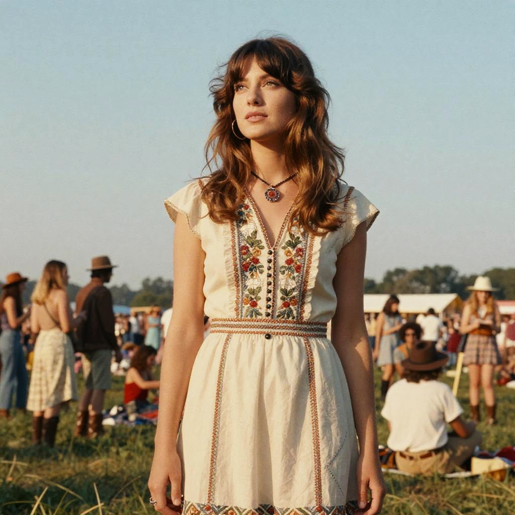 Woman in 70s Woodstock Style Dress at Outdoor Festival