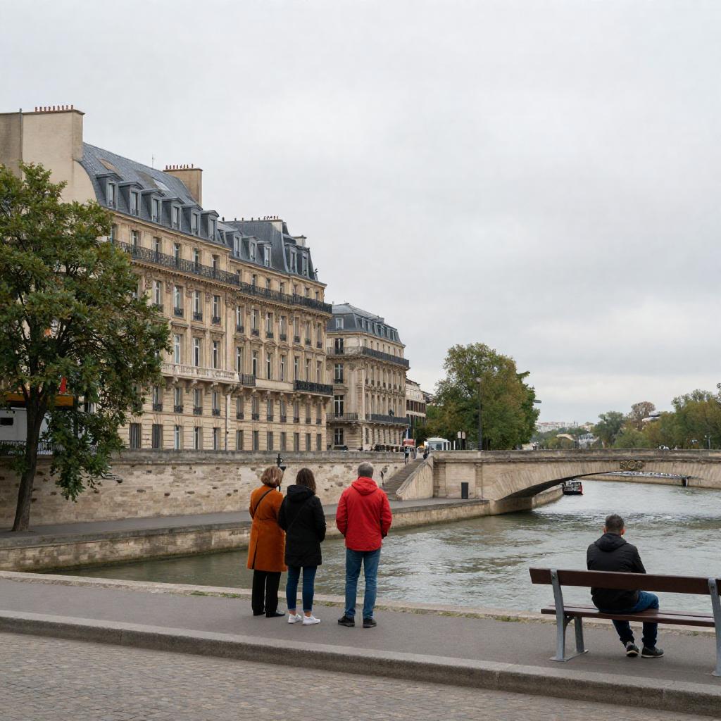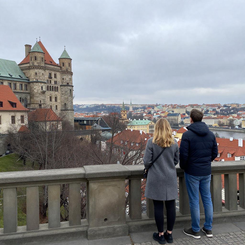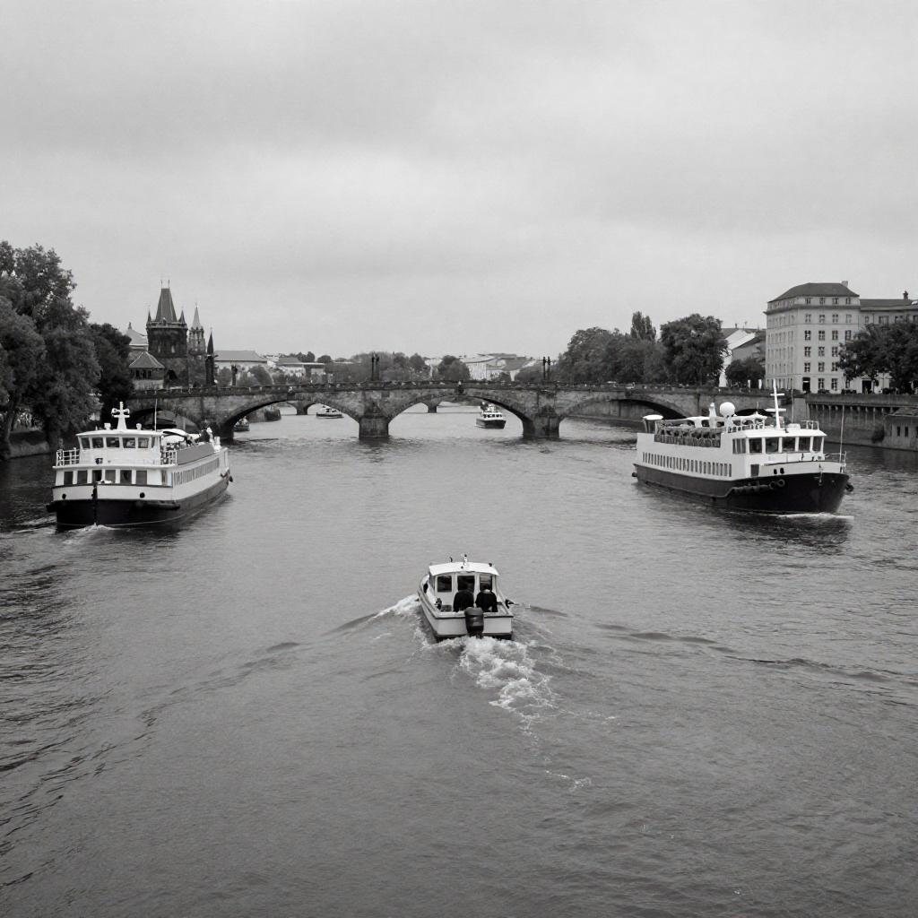 Photograph of a foggy cityscape. Gothic-style church with two tall spires on the left. Dense buildings in the foreground. River winding through the middle ground. Overcast, gray sky. No people visible. Low visibility due to fog.