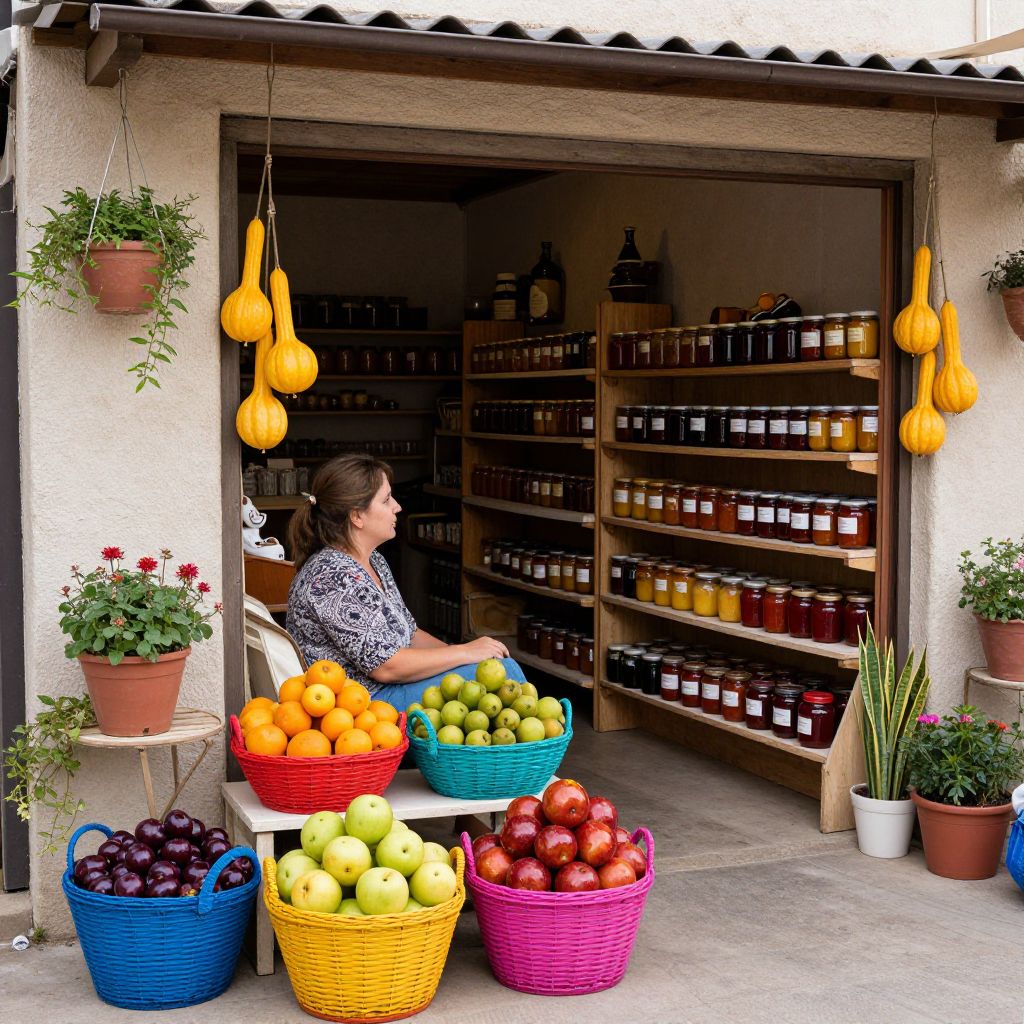 Vibrant market scene featuring a woman seated inside a rustic shop, surrounded by colorful baskets of fresh fruits and shelves stocked with jars of preserves, while hanging gourds and potted plants adorn the exterior, creating a lively and inviting atmosphere.