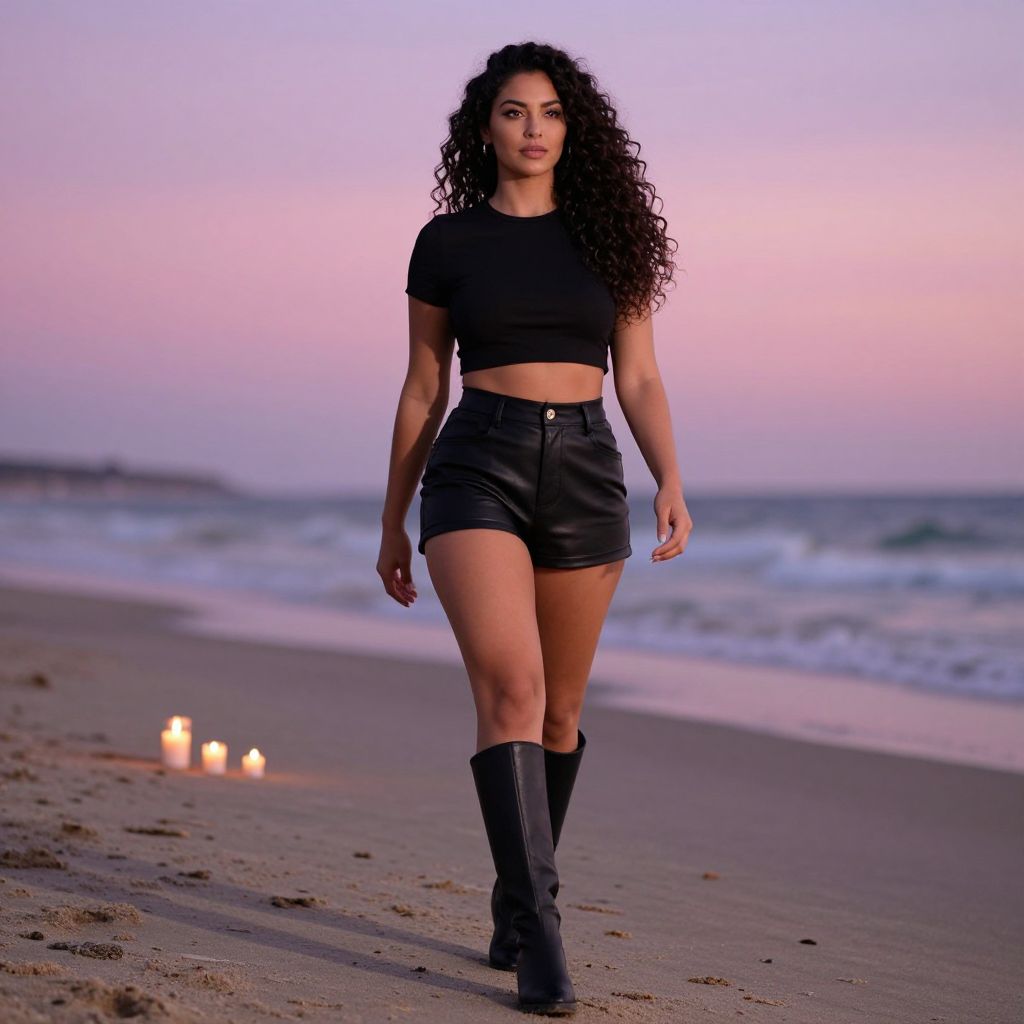 Photograph of a confident woman with long, curly dark hair walking on a beach at sunset. She's wearing a black crop top, high-waisted black leather shorts, and black knee-high boots. The beach has soft sand and small waves in the background, with several lit candles scattered on the sand to her left. The sky is a beautiful gradient of pink and purple.