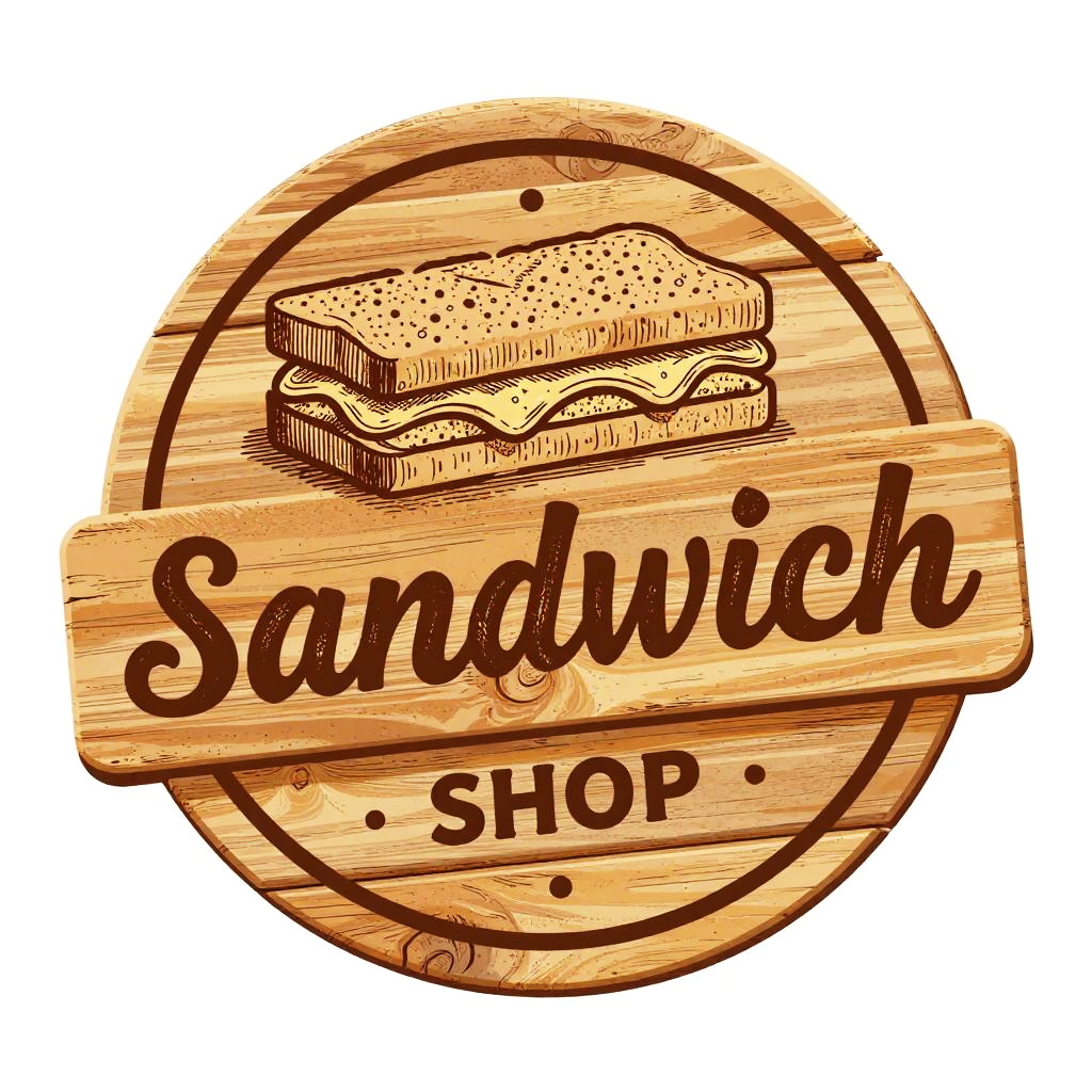 Sandwich shop logo featuring rustic wooden textures, hand-drawn sandwich elements, earthy tones and script lettering, perfect for an artisanal deli or cafe