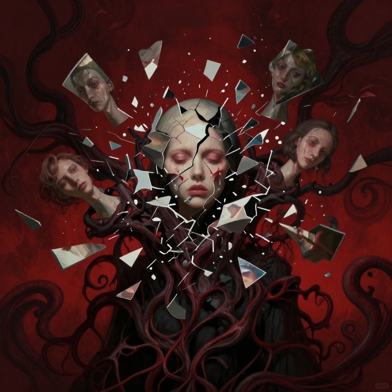 Digital artwork of a shattered face with broken mirror pieces, surrounded by three ghostly female faces, against a dark red, swirling background.