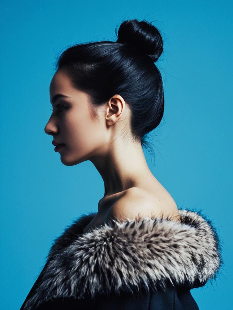 Side profile of an Asian woman with black hair styled in a single bun. She has bare shoulders and wears a black fur coat against a plain blue background. Her skin has a smooth, colored tone with red lips, visible collarbone, and subtle makeup.