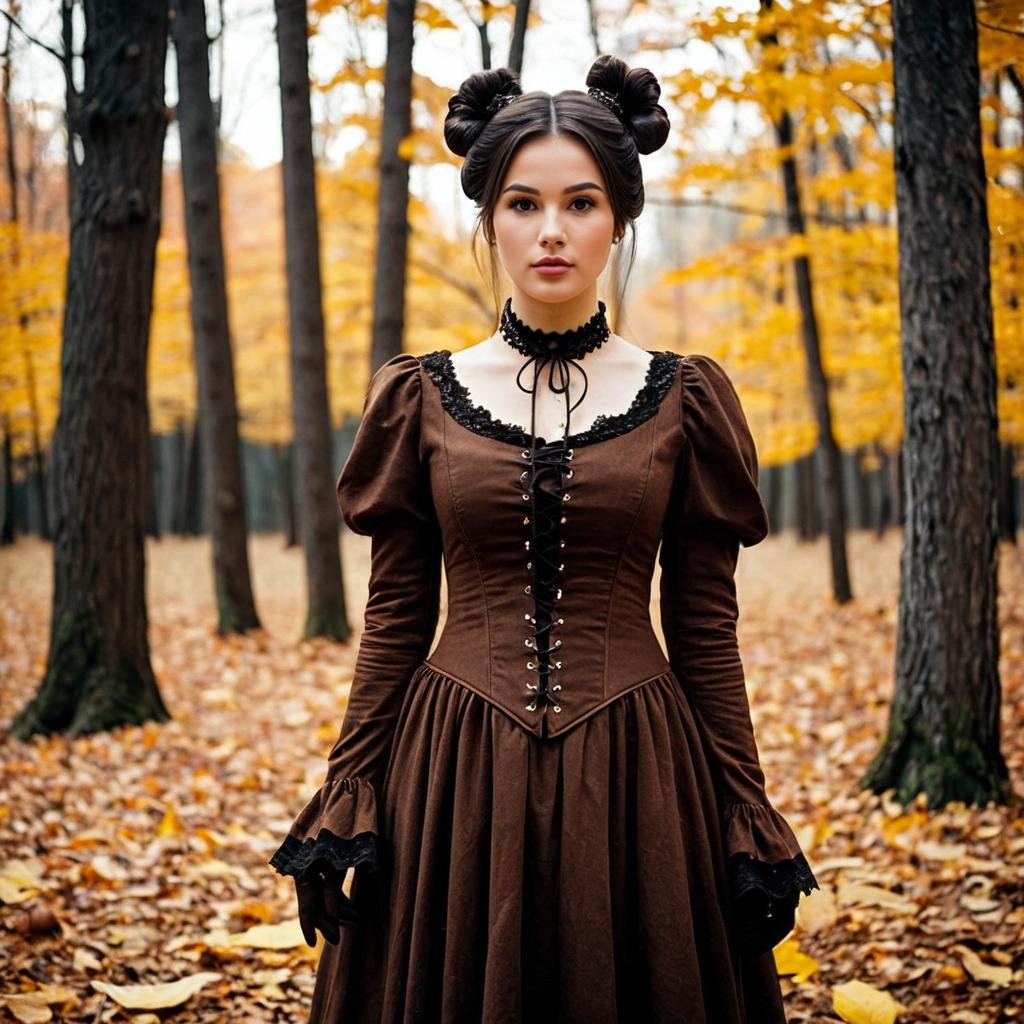 Western halloween costume, photorealistic portrait, young woman, standing in autumn forest, wearing Victorian-style dress, deep red and black corset, off-shoulder puffed sleeves, lace trim, orange floral details, black lace choker, wide-brimmed black hat with orange flowers, long wavy brown hair, serious expression, golden autumn sunlight, blurry trees in background, fallen leaves on ground, soft shadows, detailed ures, high quality, realistic lighting, slight bokeh effect, T2I generated image, vintage fashion, historical costume, fall colors, serene atmosphere