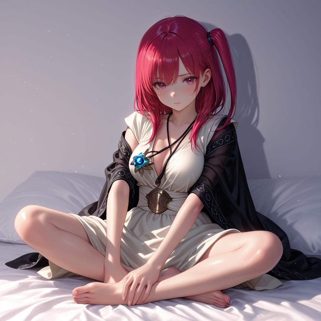 Digital illustration of Morgiana from Magi the Labyrinth of Magic, depicted as a barefoot anime girl with long red hair tied in a side ponytail and red eyes. She is seated cross-legged on a bed with white sheets, wearing a cream-colored dress with a wide belt and a dark shawl draped over her shoulders. She has a blue pendant necklace and a calm, introspective expression.
