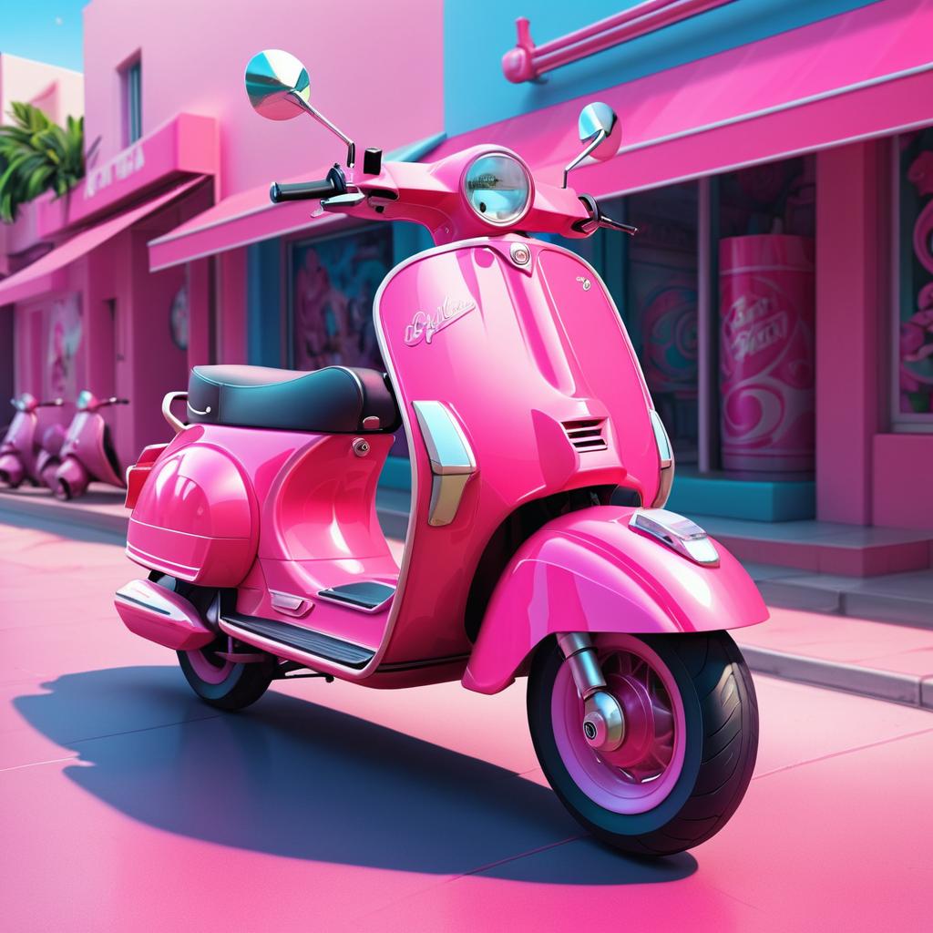 A vibrant pink retro scooter with a white seat, parked on a matching pink tiled surface. The background includes a pink building facade with teal window frames and a pink awning, complemented by greenery. The scooter features a classic design with a round headlight and chrome rear rack, styled with bright, vivid colors and a playful, comic-inspired aesthetic.