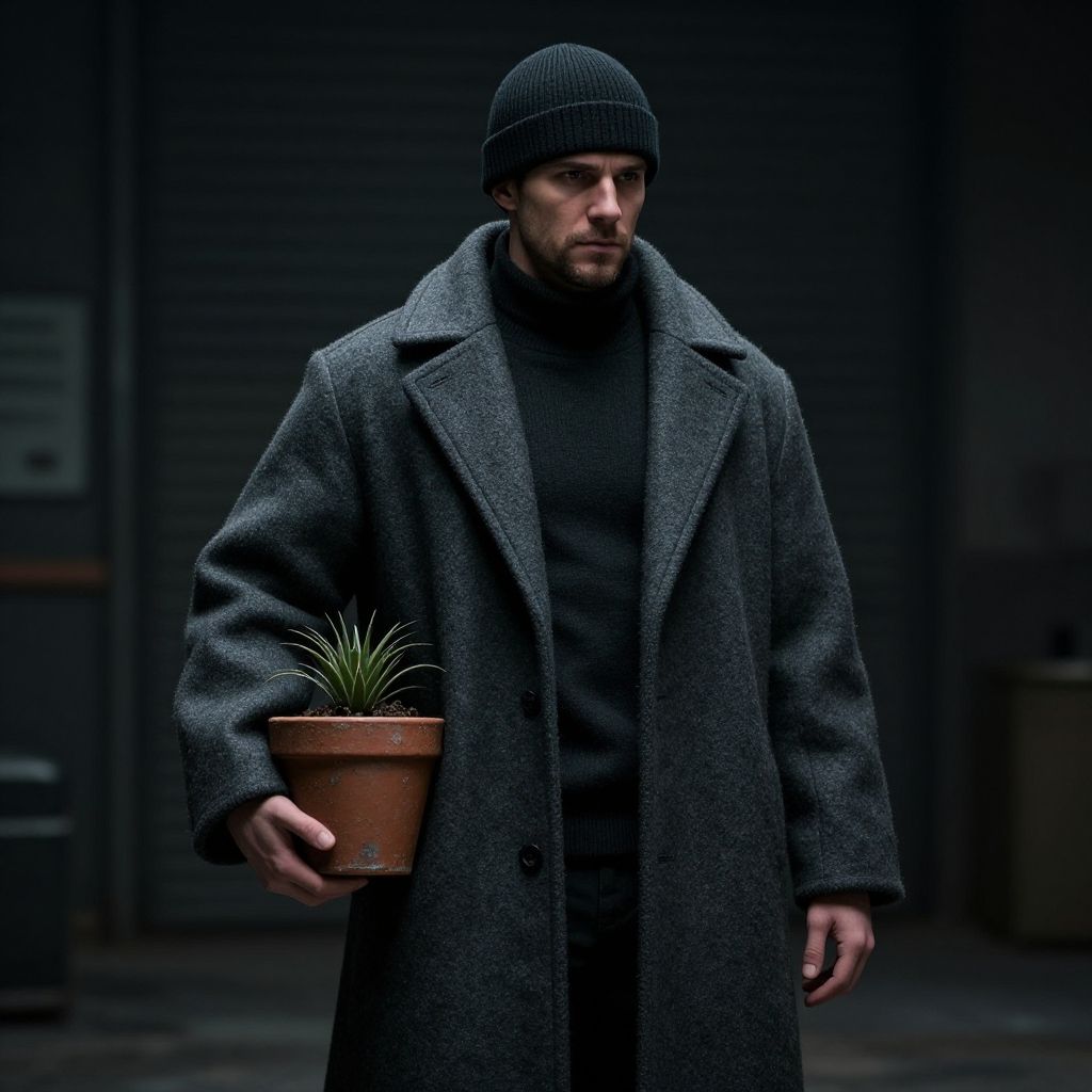 Photograph of a serious-looking man with light skin and a short beard, wearing a dark grey knit beanie, black turtleneck, and long, textured grey overcoat. He holds a small terracotta pot with a green, spiky plant in his left hand. The background is dimly lit with a dark, industrial setting, including a closed metal shutter and a faintly visible sign. The overall mood is moody and somber, with a focus on the man and the plant, emphasizing a contrast between urban and natural elements.