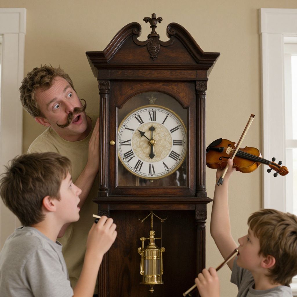 Photograph of a humorous scene featuring a man with curly hair and a thick mustache, wearing a beige shirt, peering over a large, dark wooden grandfather clock with a white clock face and black Roman numerals. Two boys, one with brown hair in a gray shirt and the other with light brown hair in a gray shirt, are standing in front, one holding a violin and the other looking up at the clock. The background has beige walls and white door frames, creating a domestic setting. The man's surprised expression contrasts with the boys' focused actions.