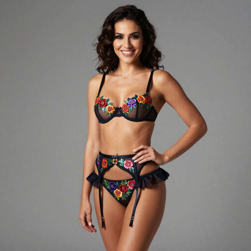 ((Masterpiece, best quality, edgQuality, photorealistic, hyper realistic)), smile--, edgGrk_woman, edgGrk_face, edgGrk_body, a woman posing for a picture, portrait, a woman in a lingerie posing for a picture, wearing the garterbelt, colorful, floral embroidery, frilled skirt