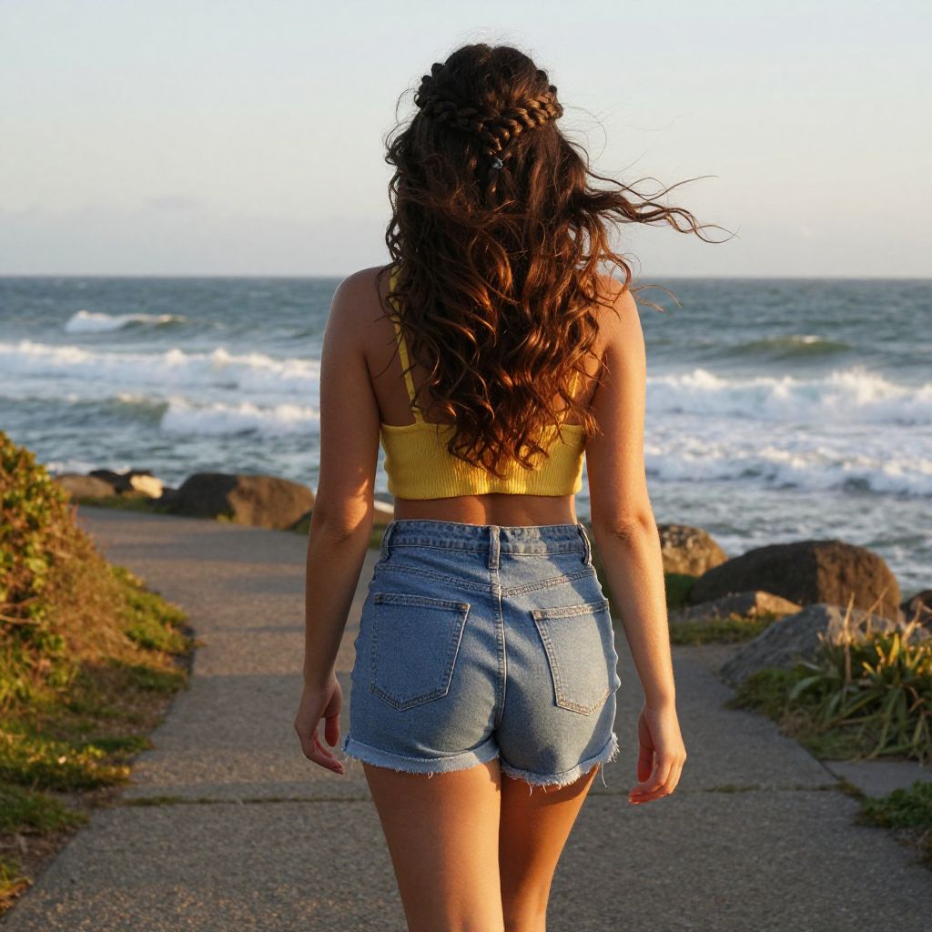 Woman with braided half-up with volume hairstyle walking down a coastal path at dawn, waves gently crashing, golden hour glow, wind flowing through her hair, natural outdoor setting, soft shadows, vibrant colors, photorealistic style.