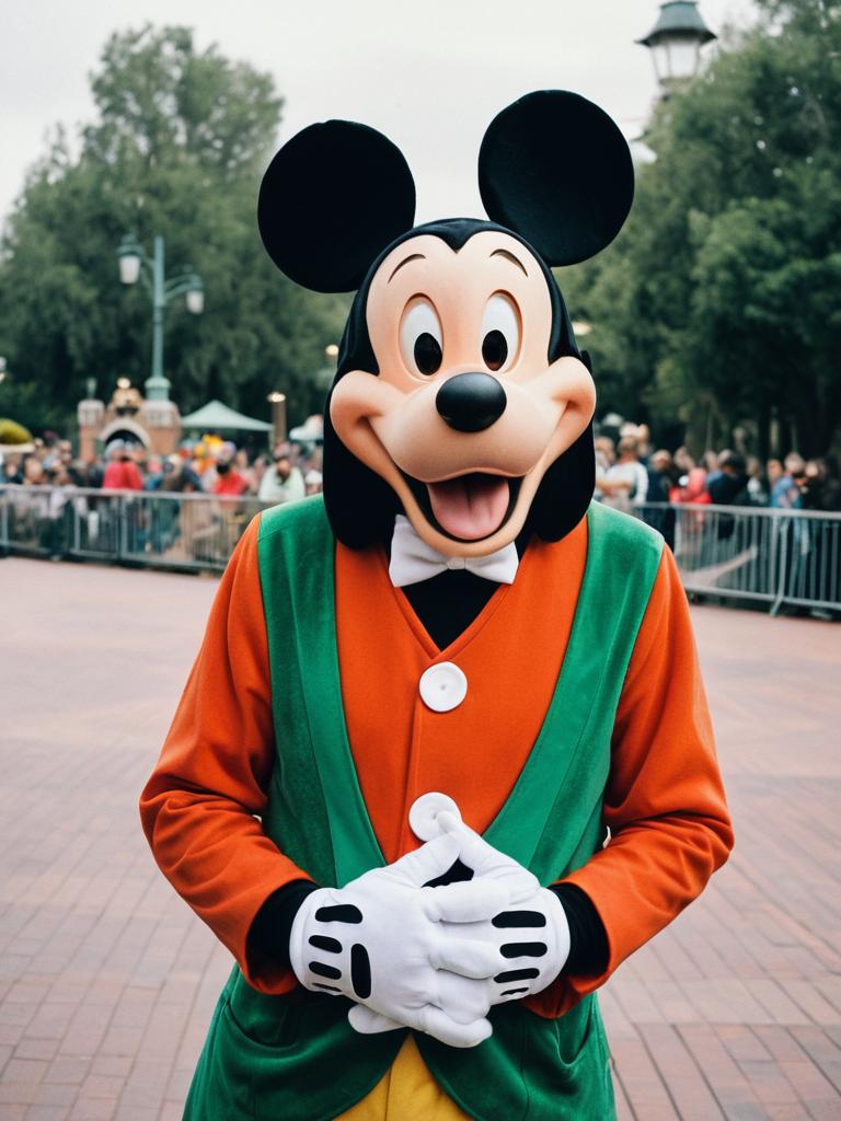 Man in Disney Goofy costume, outdoor cosplay portrait, cinematic realism