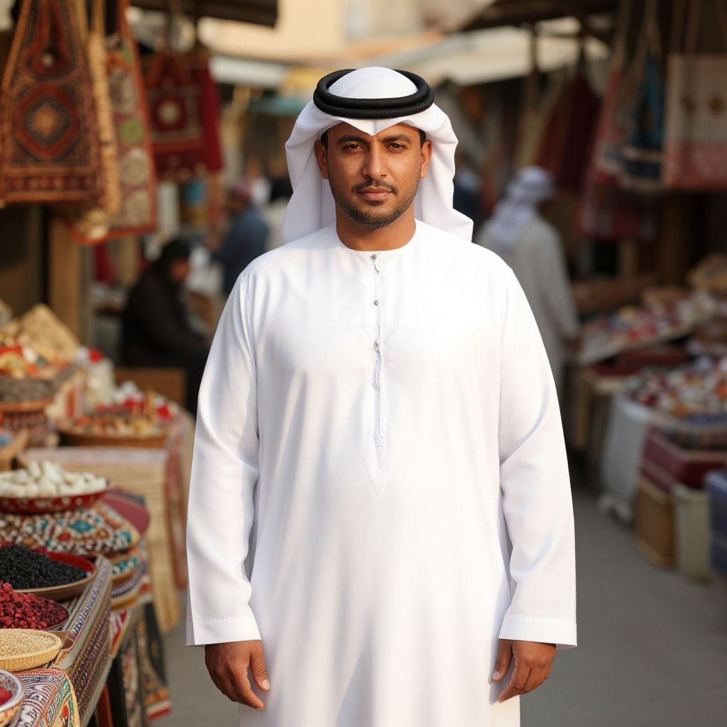 Photograph of a Middle Eastern man in a white traditional thobe and black and white kufi, standing in a colorful outdoor market.