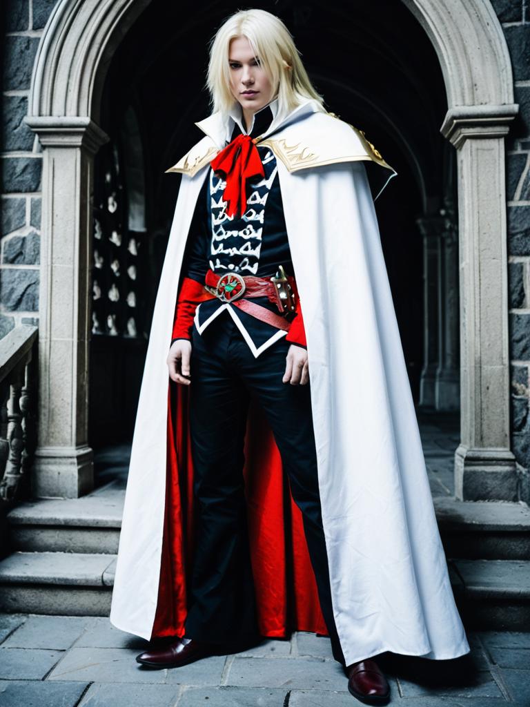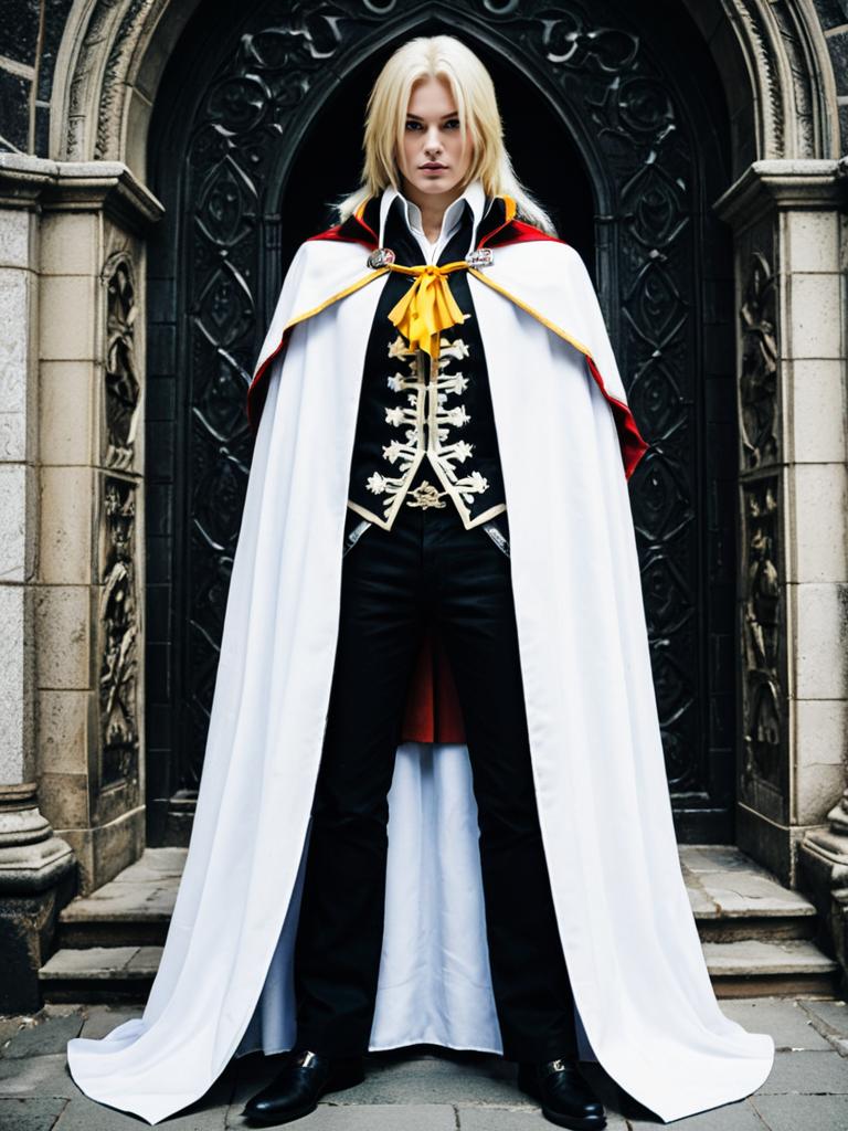 Full body photo of a male cosplayer dressed as Alucard from Castlevania. The subject has long blonde hair and yellow eyes, wearing a detailed black and white outfit with a white cape featuring red and gold trim. The background features an ornate Gothic-style arched door and stone architecture.