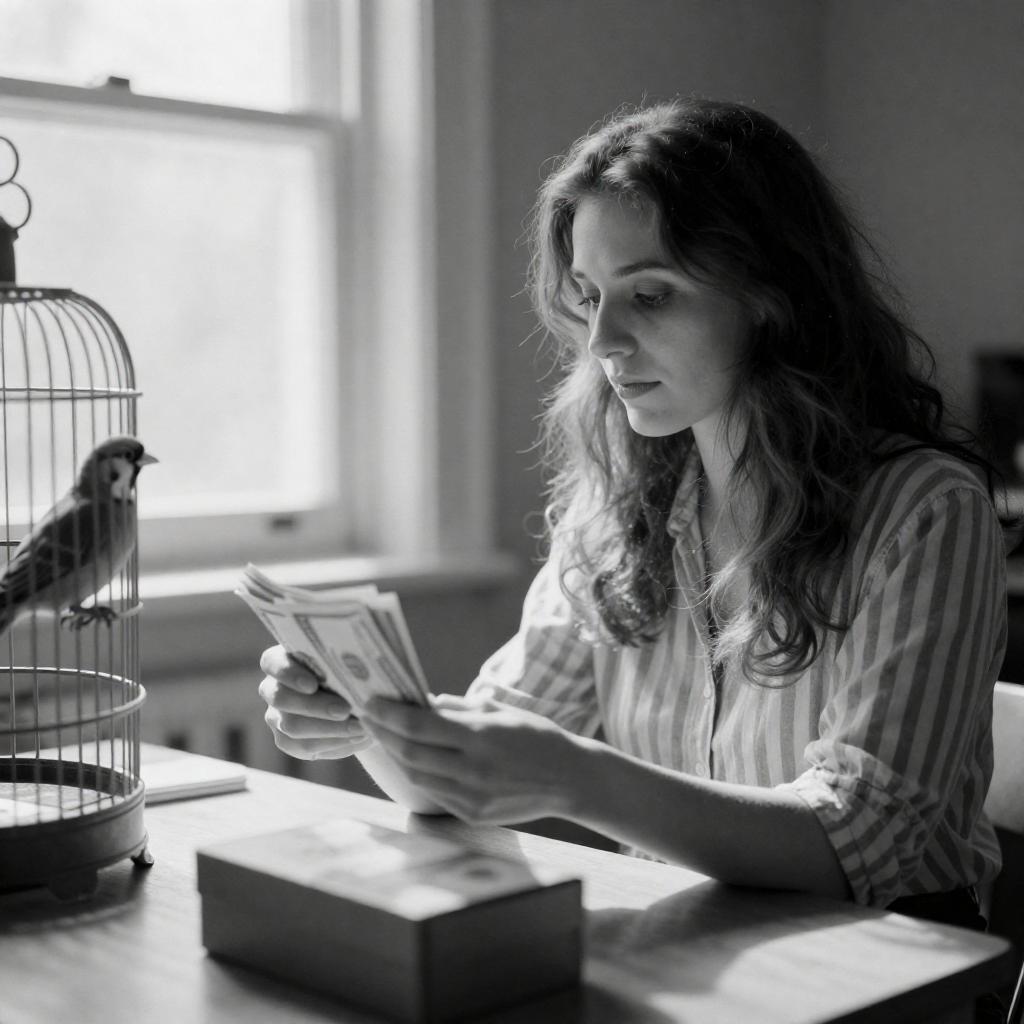 Black-and-white photograph of a woman with long, wavy hair, wearing a striped shirt, sitting at a desk, holding a stack of money while a bird in a cage stands on the left. Bright light from a window illuminates her face and hands, casting deep shadows. A box is on the desk in the foreground.