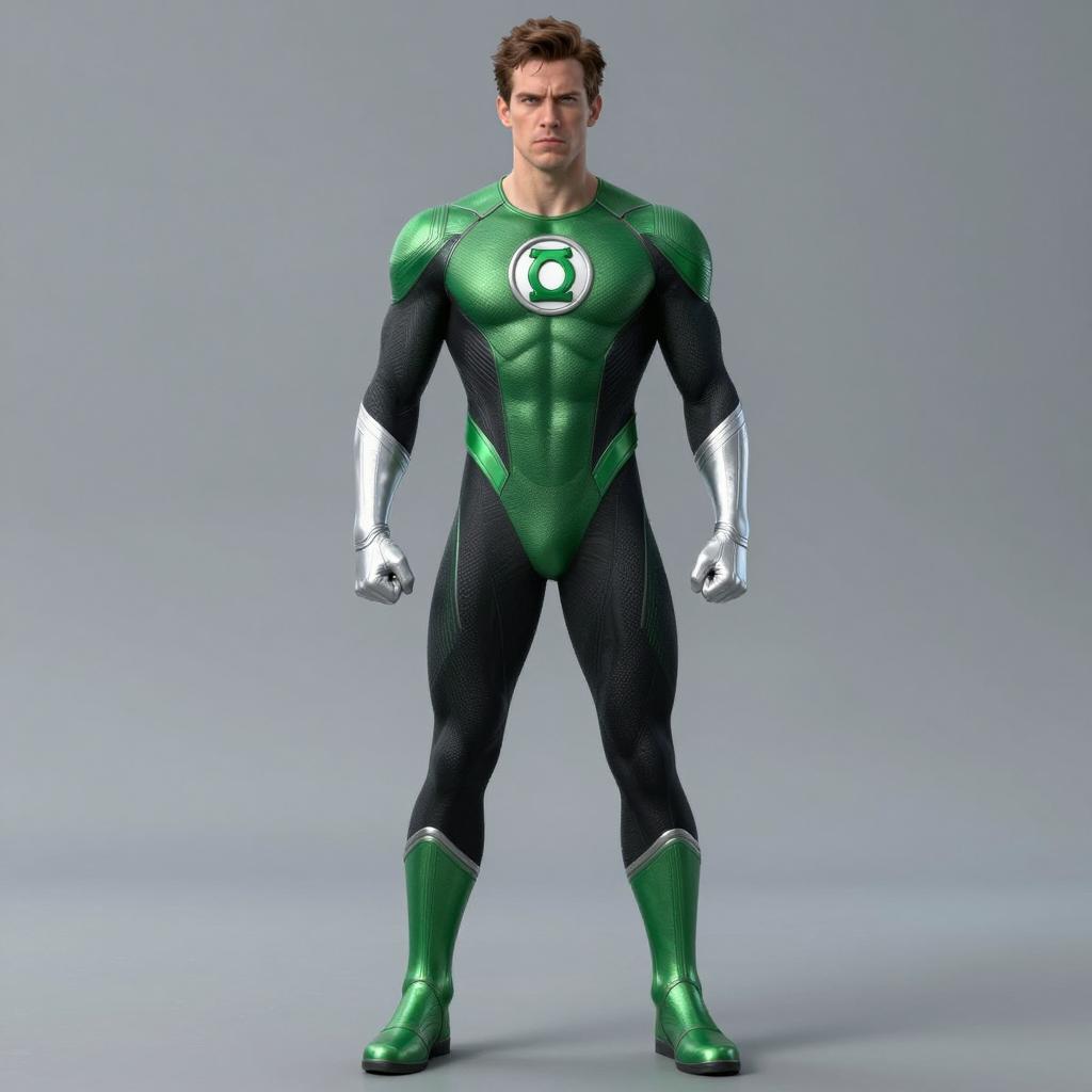Photorealistic digital art of a male superhero character wearing a green and silver futuristic armor suit with a green emblem on the chest. The muscular figure with visible abs has short brown hair and a serious expression, standing in a symmetrical pose against a neutral foggy background. The detailed CGI rendering showcases realistic lighting, shadows, and highlights.