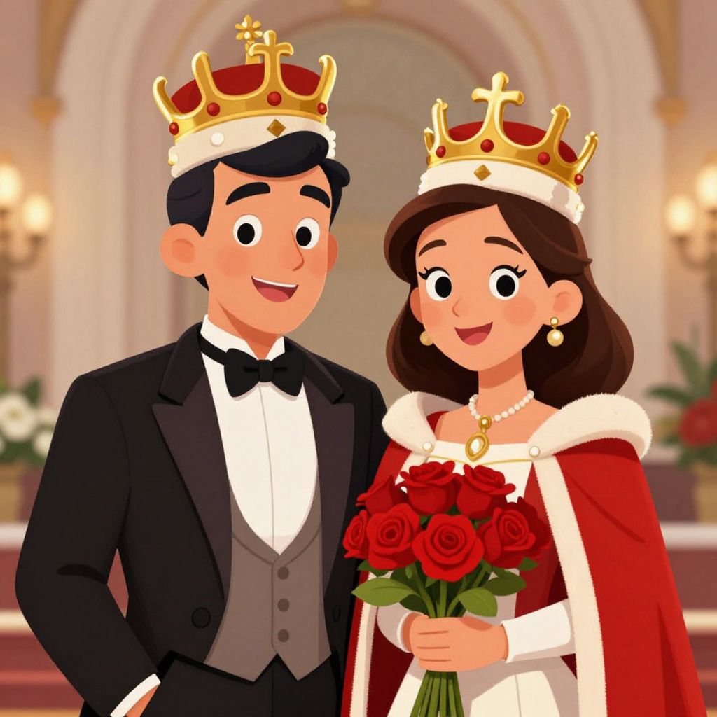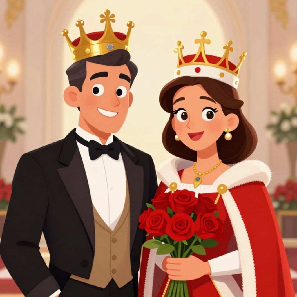 A vibrant cartoon-style illustration depicts a royal couple adorned with ceremonial crowns, exuding joy as they stand together; the man in a classic tuxedo and bow tie, and the woman holding a bouquet of red roses, both rendered in high-definition detail with soft, warm lighting that enhances their regal presence.