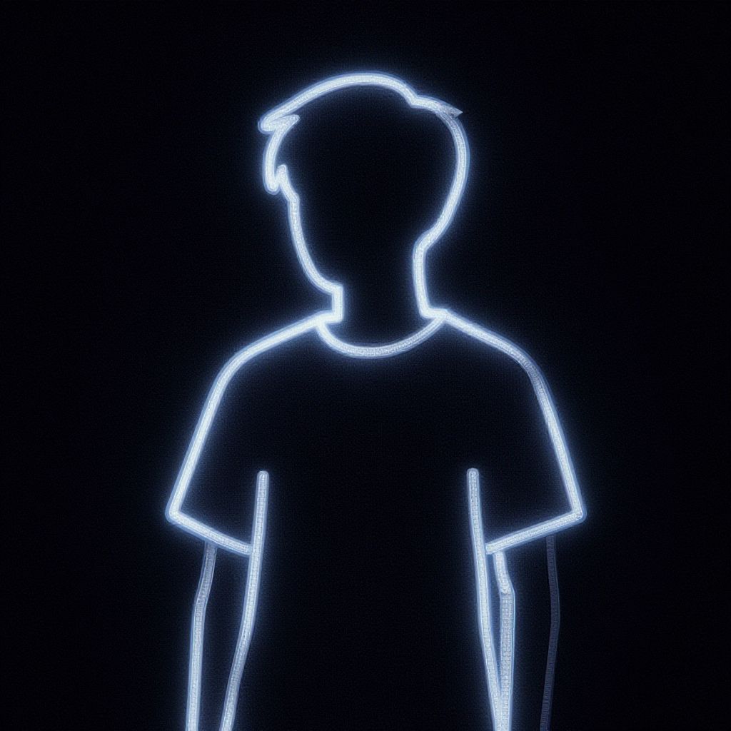 Neon blue outline of a silhouette against a black background, depicting a person with short hair and a t-shirt.