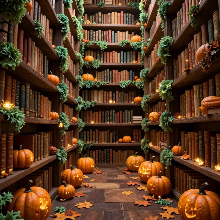 In a fantastical 3D-rendered library, ancient books line endless shelves adorned with glowing lichens and autumnal pumpkins, creating an enchanting atmosphere where nature and literature intertwine in a cyberpunk-meets-fantasy visual narrative.