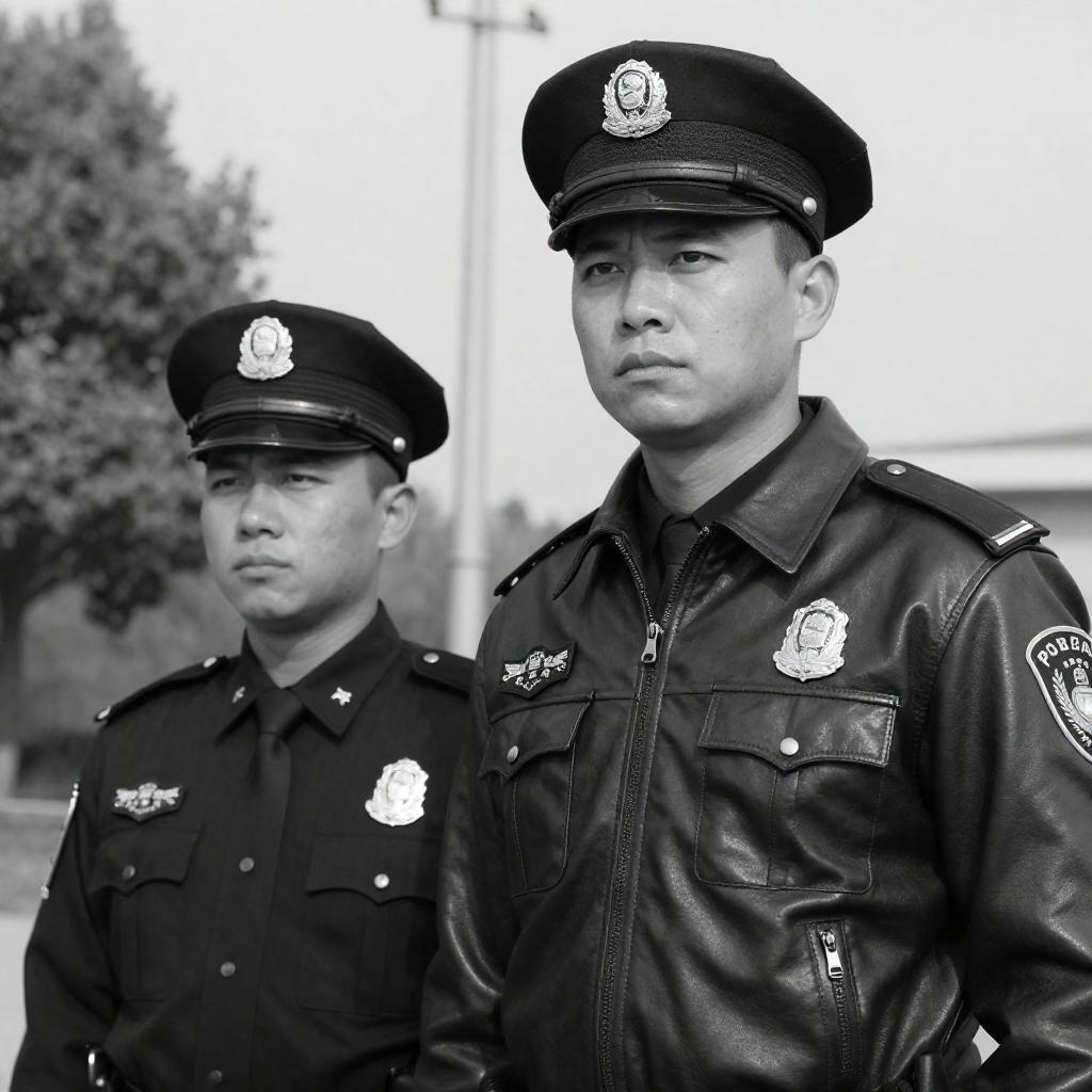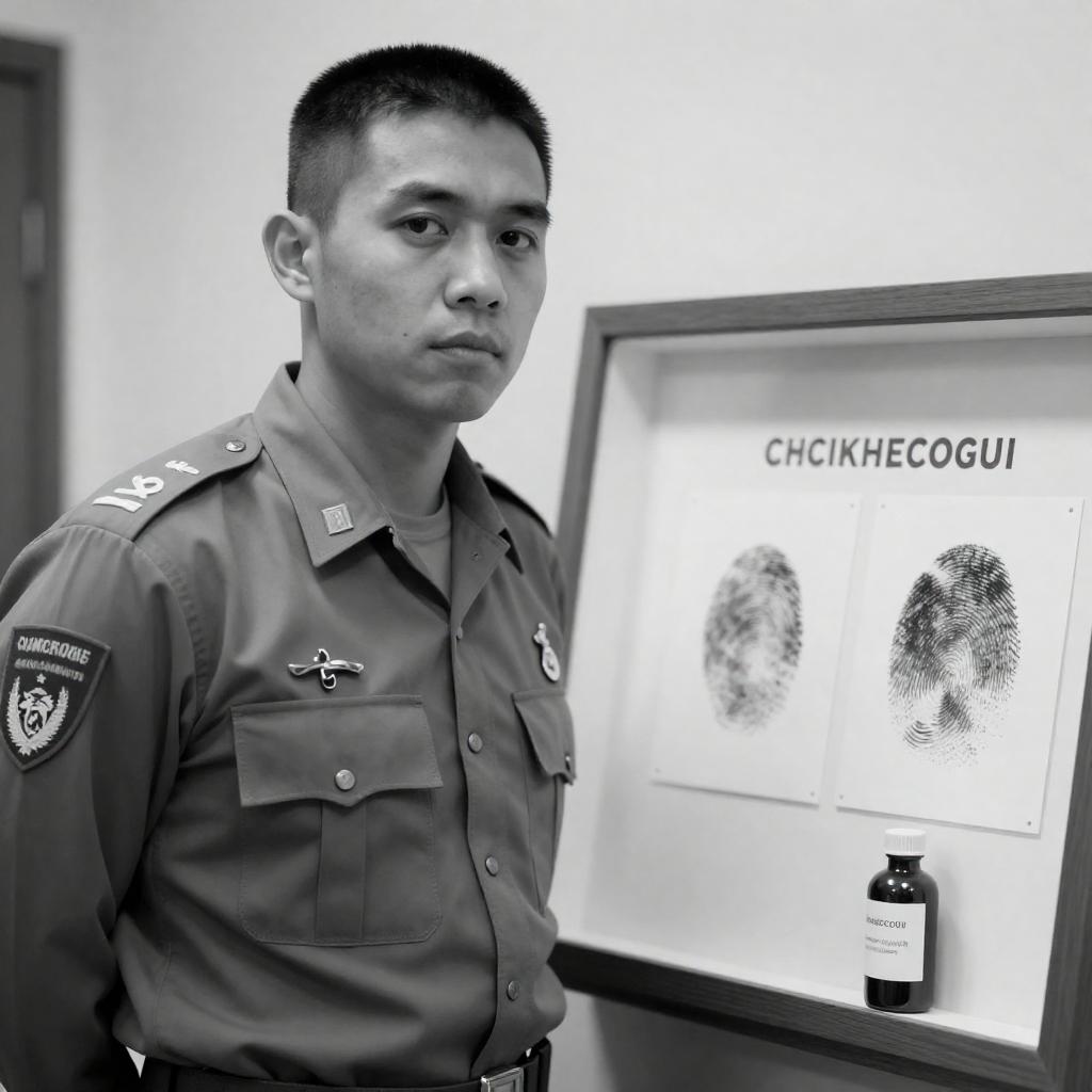 Black-and-white photograph. Male officer with short, dark hair, wearing military uniform, serious expression, standing left. Right: display case with fingerprint and sealed bottle with fingerprint label. Background: ured wall. Officer's left shoulder visible.