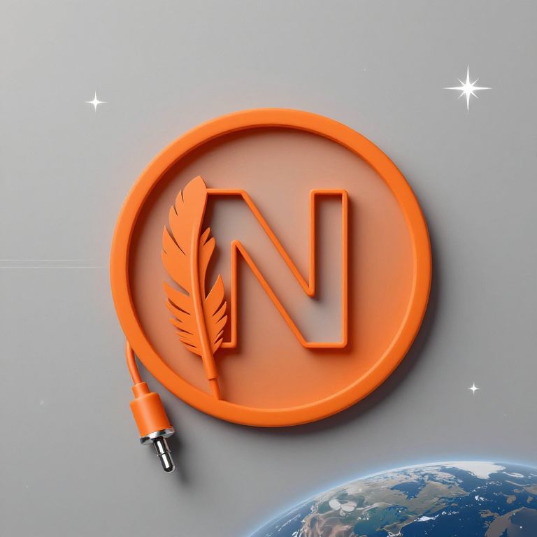 Feather a logo a orange circle with the letter N in the middle made from a headphone lead jaxx plug. Futuristic. clay gray background. stars . Spacship view of earth. Art .,