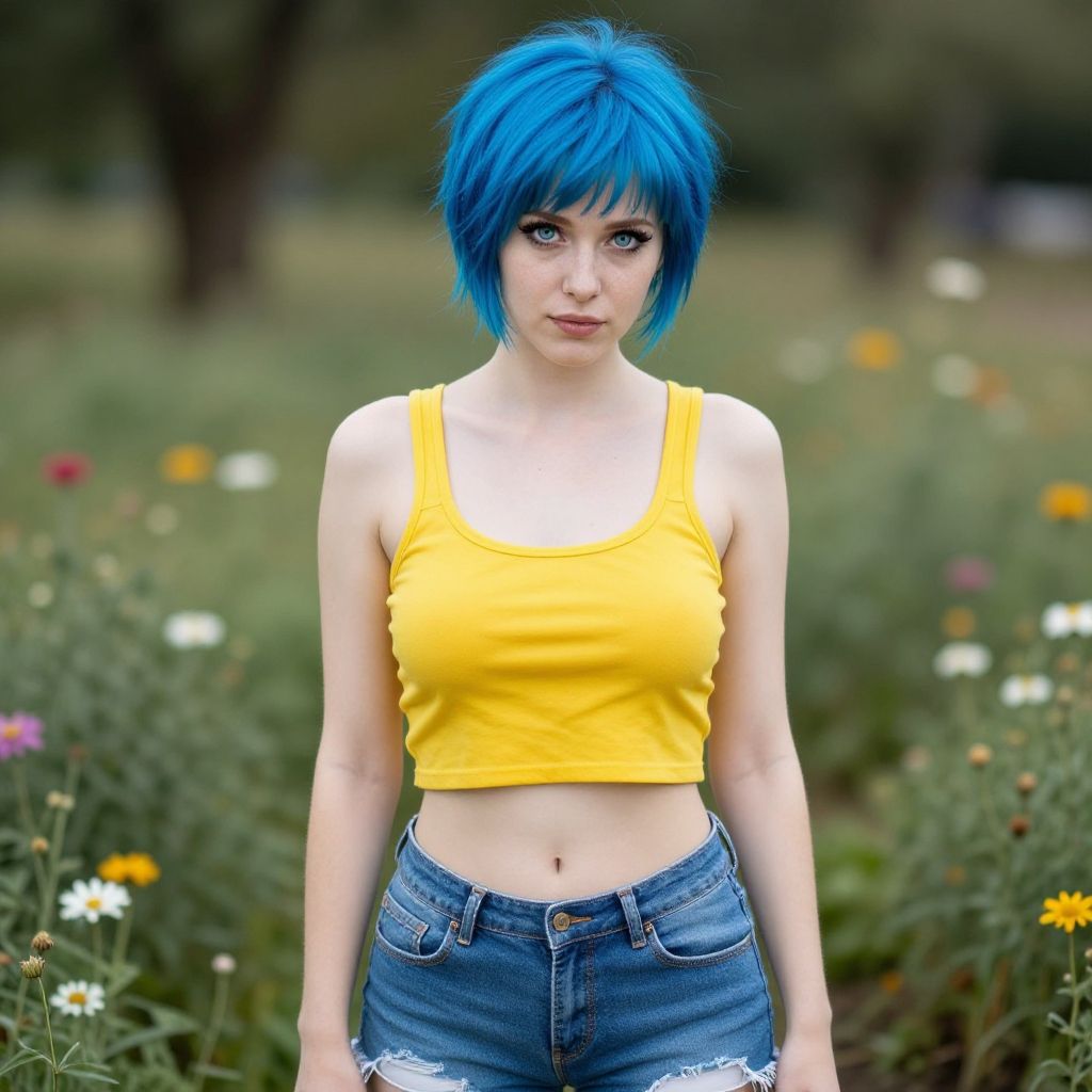 Photo, full body shot, of a young woman standing in a flowery garden, yellow crop top, cutoff jeans, medium breast, sexy, slight smirk, highly detailed face, pale skin, highly detailed skin, freckles, blue hair, pixie cut, blue eyes, realistic, detailed, bokeh, high detail eyes, high detail hair, cartoonified-pupils, soft light
