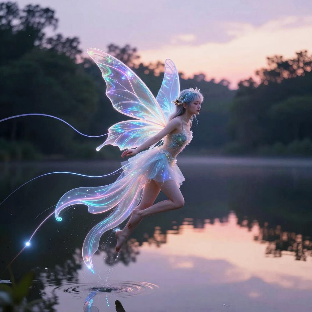 Fairy AI, a delicate cybernetic fairy hovering above a sparkling lake under a twilight sky, shimmering holographic wings, neon light trails, mystical forest reflection, blending technology and fantasy with vibrant colors and dreamy lighting.