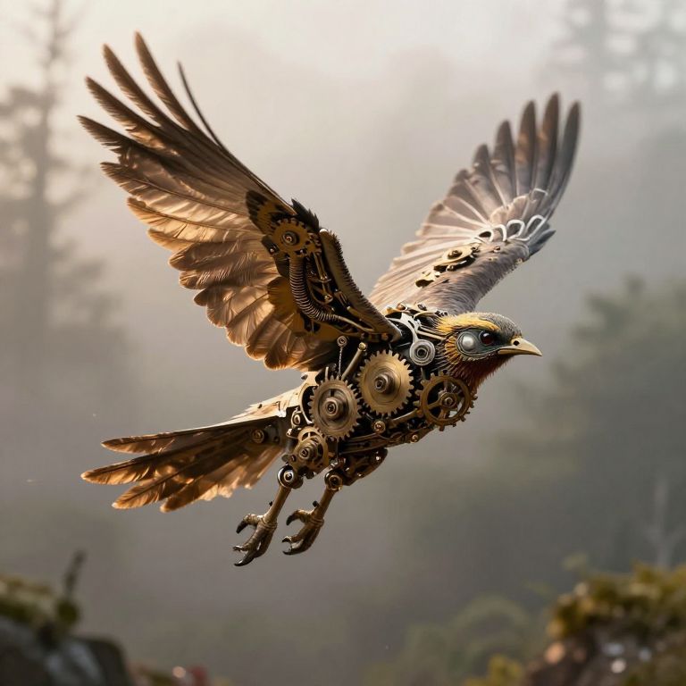 Kinetische mechanical bird in flight, feathers as finely tuned gears and springs, soaring above a misty forest at dawn, detailed steampunk aesthetic combined with natural elements, intricate textures and warm golden lighting accentuating its dynamic pose.