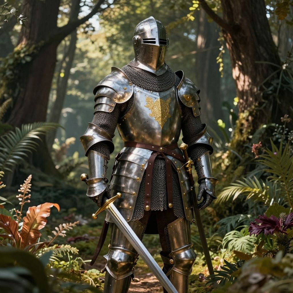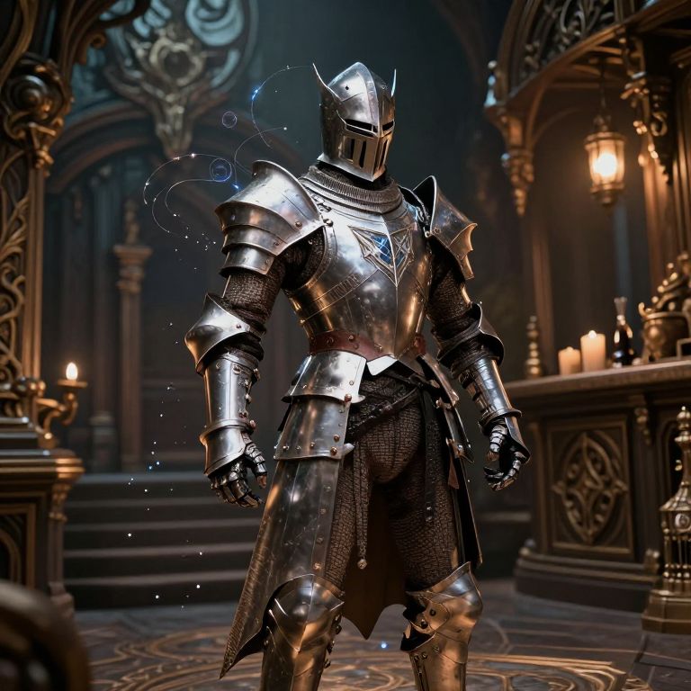 A mannequin standing confidently in a dimly lit medieval courtyard, wearing detailed medieval armor with a bronze and iron plating suit, a pointed helmet with a crest, and a flowing crimson scarf tied around the neck. The armor is intricately crafted with rivets and decorative engravings, giving it a lifelike and ancient appearance. The mannequin's posture is upright and poised, with one hand slightly raised as if holding a sword, while the other rests on the hilt. The background features stone walls, a rustling tree, and a faintly glowing torch in the distance, adding a mystical atmosphere. The lighting is soft and warm, casting long shadows, with subtle reflections on the armor surface.