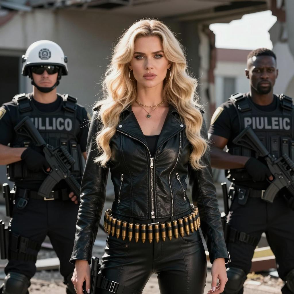 Blonde woman with curled hair, wearing black leather harness with chains, standing in front of metal grate. Background has multiple lit candles. Man with red plaid shirt, partially visible on left. Woman's mouth slightly open, showing teeth. Jewelry: small earrings. Intense expression. Two people.