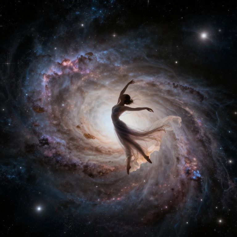 Digital art: Silhouetted dancer in flowing dress, arms gracefully raised, floating within a vibrant, swirling galaxy with a bright central light.