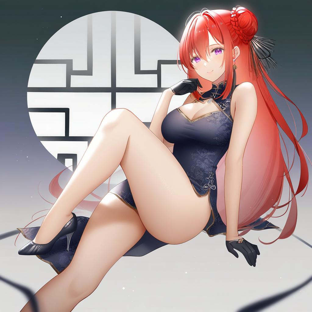 This is a digital anime-style illustration of a red-haired woman with long, flowing hair tied in a small black bow. She has purple eyes and wears a black, lace-trimmed, sleeveless cheongsam with a high collar and revealing cutouts. She is seated with one leg crossed over the other, showing her smooth, fair-skinned legs. She wears black gloves and black ankle boots with heels. The background features a large, white, geometric patterned circle against a gradient blue-to-black background. The woman's confident, slightly flirtatious expression and relaxed pose create a sensuous, elegant atmosphere.
