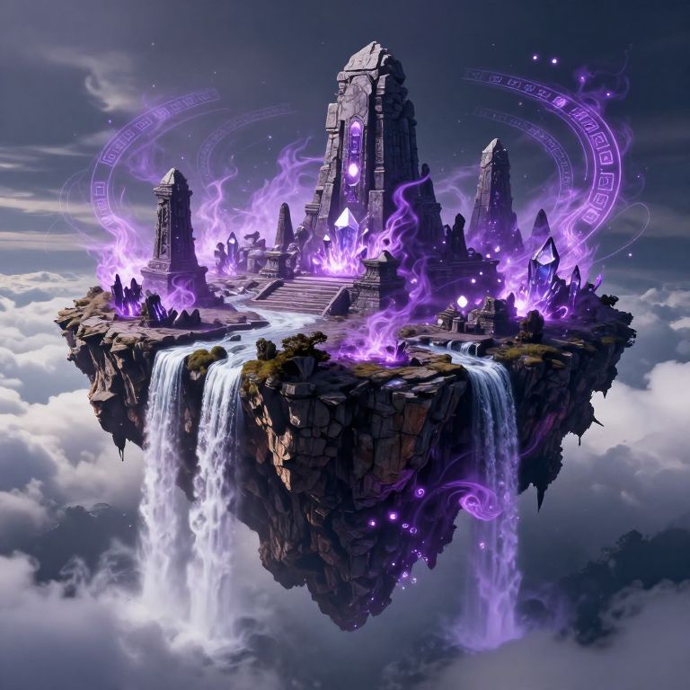 A massive, floating sky island, suspended high above the clouds, its jagged terrain and cliffs wrapped in swirling, ethereal purple flames, The island is dotted with towering, ancient stone ruins and colossal waterfalls that cascade off the edge, dissolving into mist before reaching the ground, Crystals of energy pulse with light embedded in the island’s surface, and glowing runes float around it in a chaotic, magical orbit