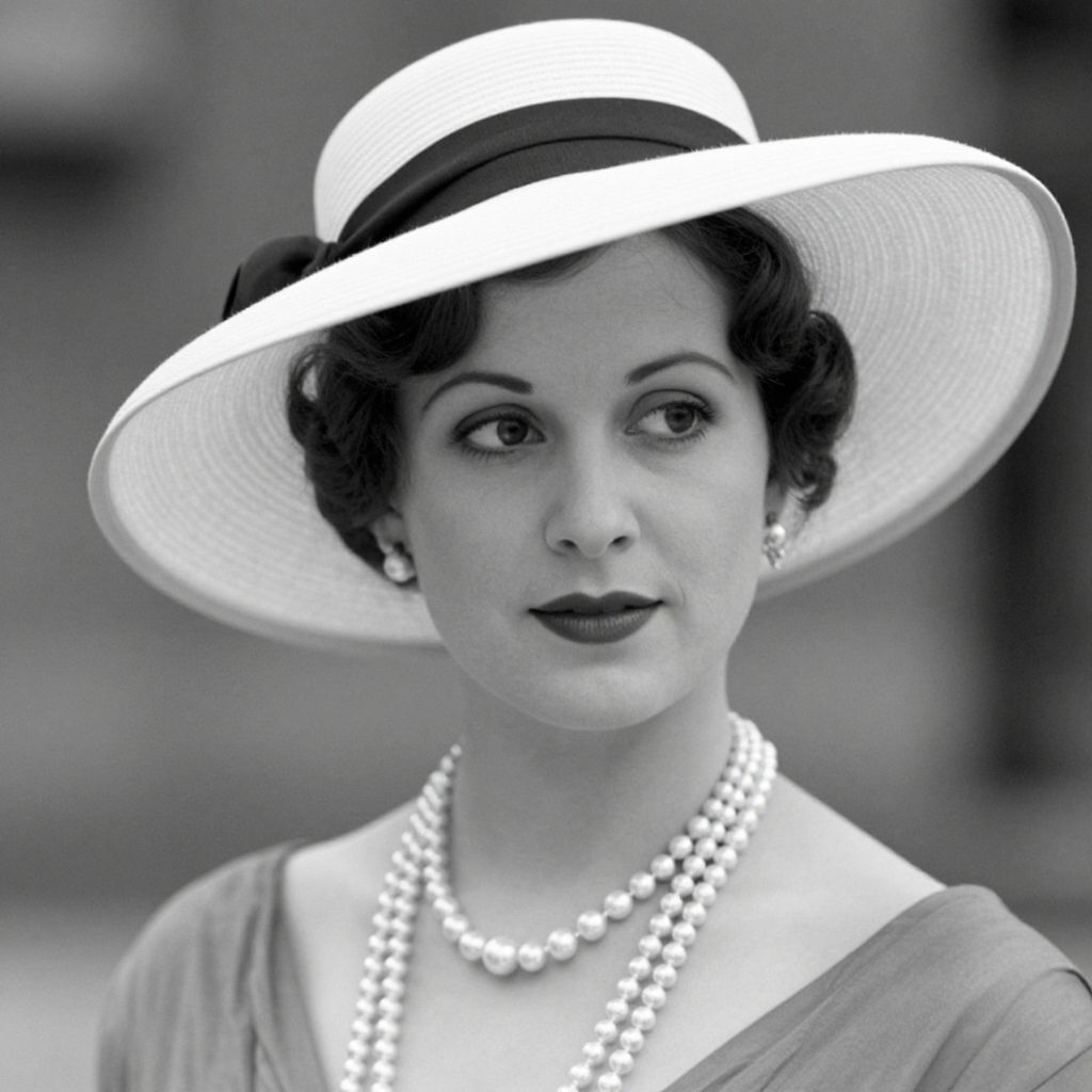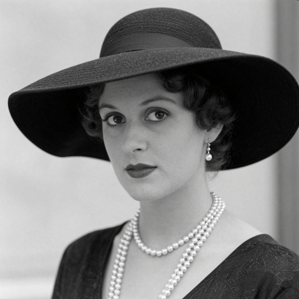 A black-and-white photograph captures a woman adorned in a vintage style, featuring a wide-brimmed hat and a pearl necklace, evoking the elegant fashion trends of the early 20th century with a classic, timeless aesthetic.