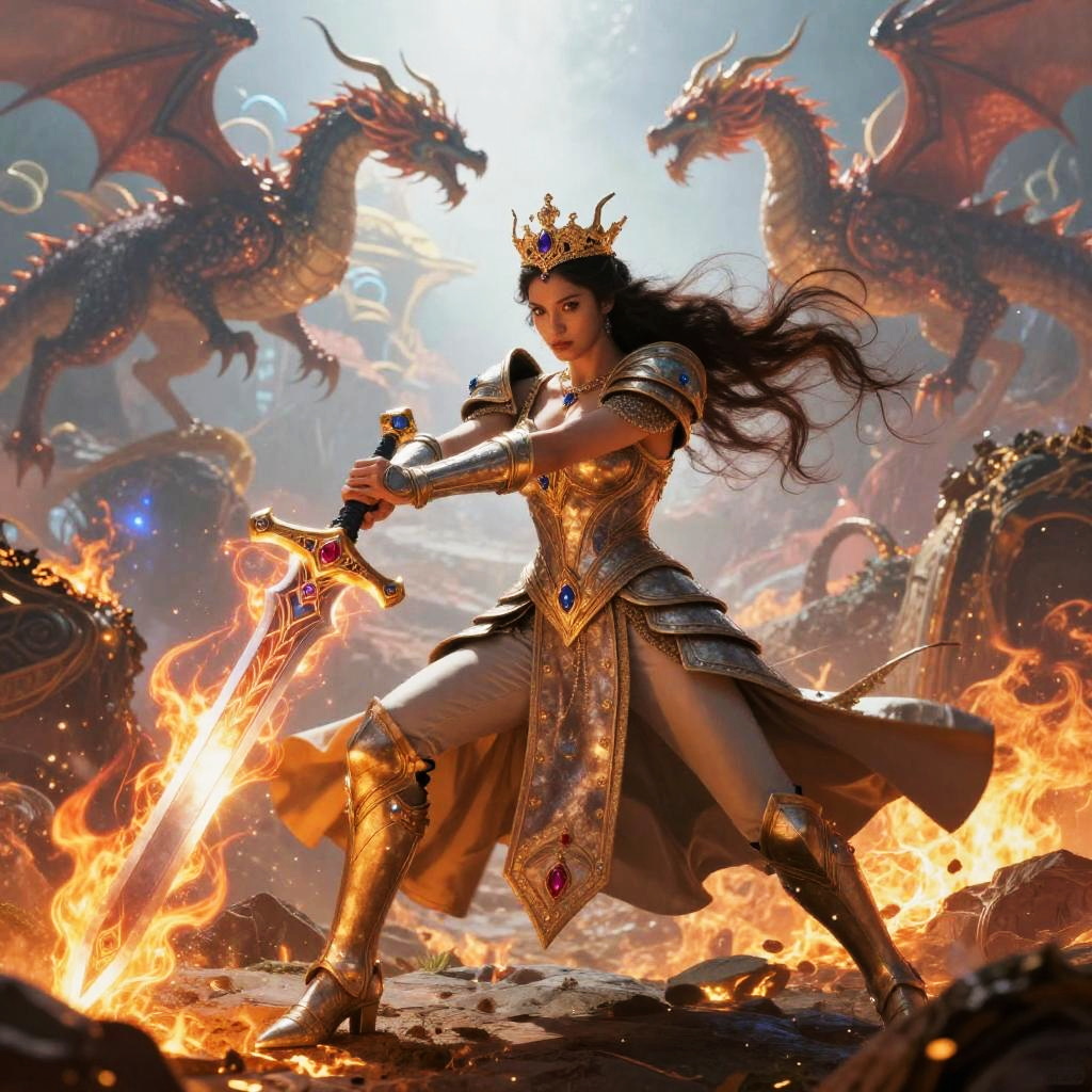 Queen fantasy art illustrating a warrior queen in dynamic battle pose, wielding a mystical sword that emits magical flames, dressed in regal armor adorned with gemstones, with a fiery battlefield and ethereal dragons soaring overhead in a vivid, otherworldly landscape.