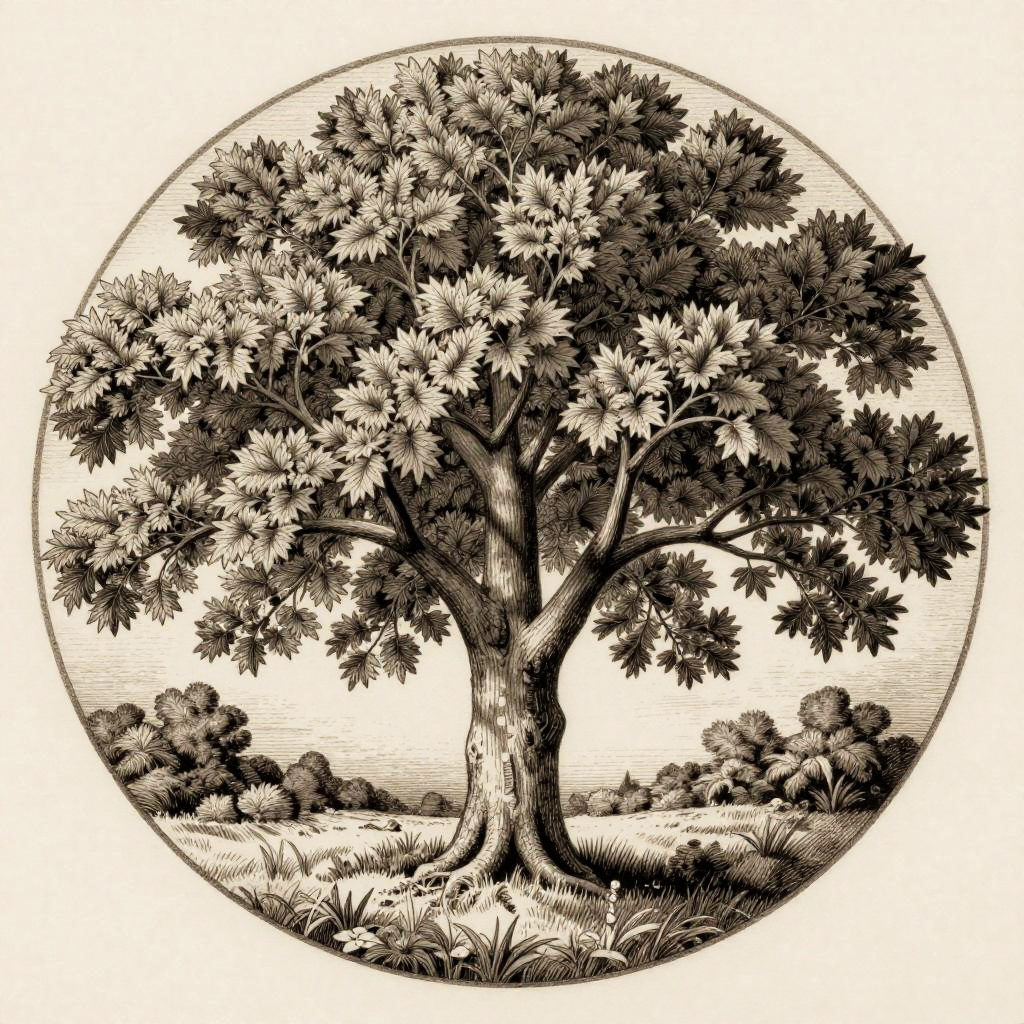Black-and-white vintage engraving of a large, leafy tree with a thick trunk, surrounded by a circular frame and distant bushes.