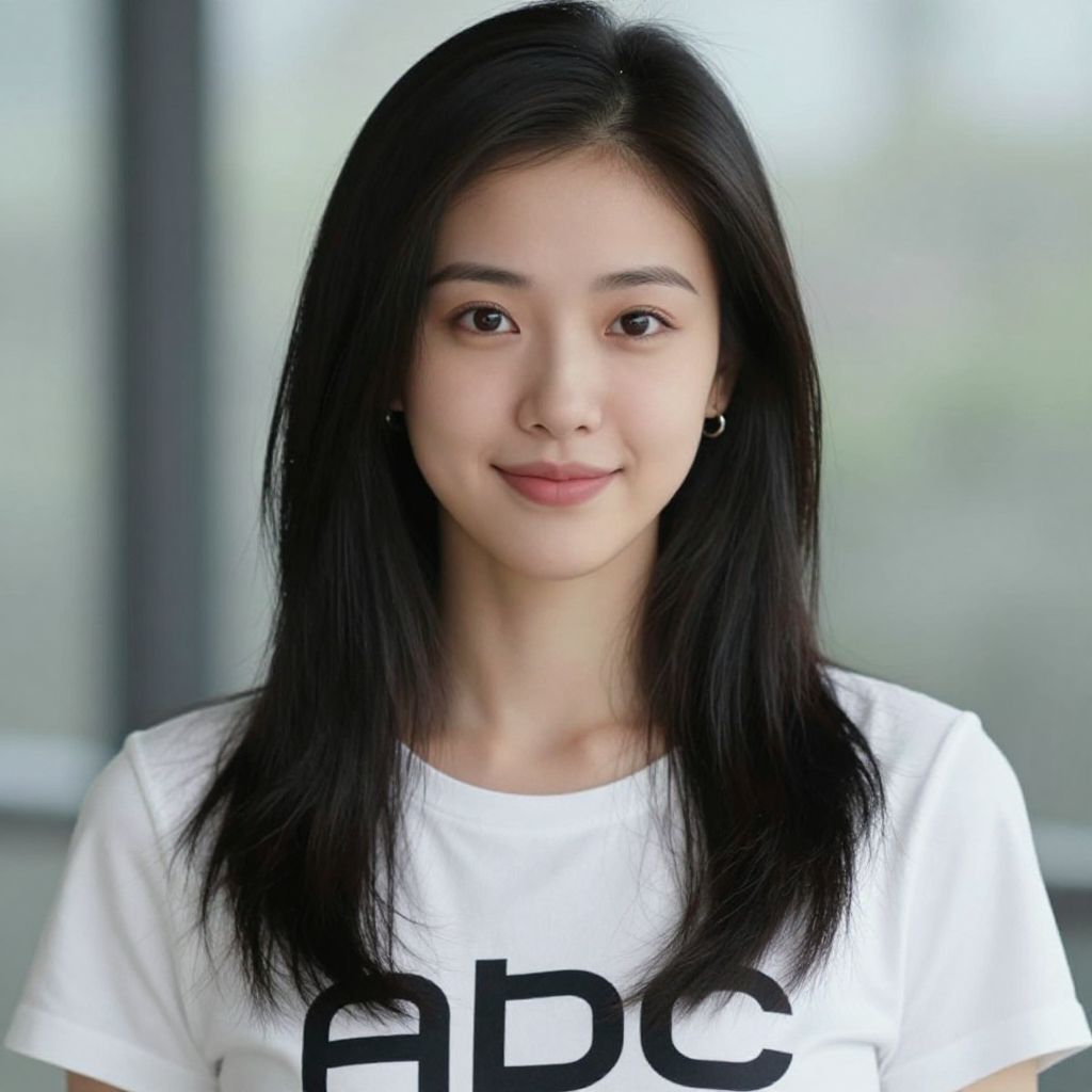 Photograph of an Asian woman with fair skin and dark hair styled in a high bun. She has a neutral expression and is wearing a white, short-sleeved, button-up shirt. The background is blurred, showing a light-colored wall with a dark vertical beam and a hint of greenery on the left. The image has a soft, natural light, emphasizing her facial features and the crispness of her white shirt. The focus is on her face and upper body, with a shallow depth of field.