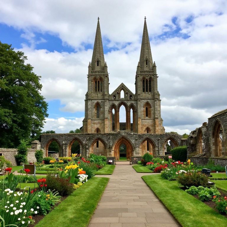 Tintern Abbey stands majestically amidst lush greenery, its twin spires piercing the sky as a stone pathway winds through the ruins, flanked by vibrant gardens and ancient arches under a serene blue sky dotted with fluffy clouds.