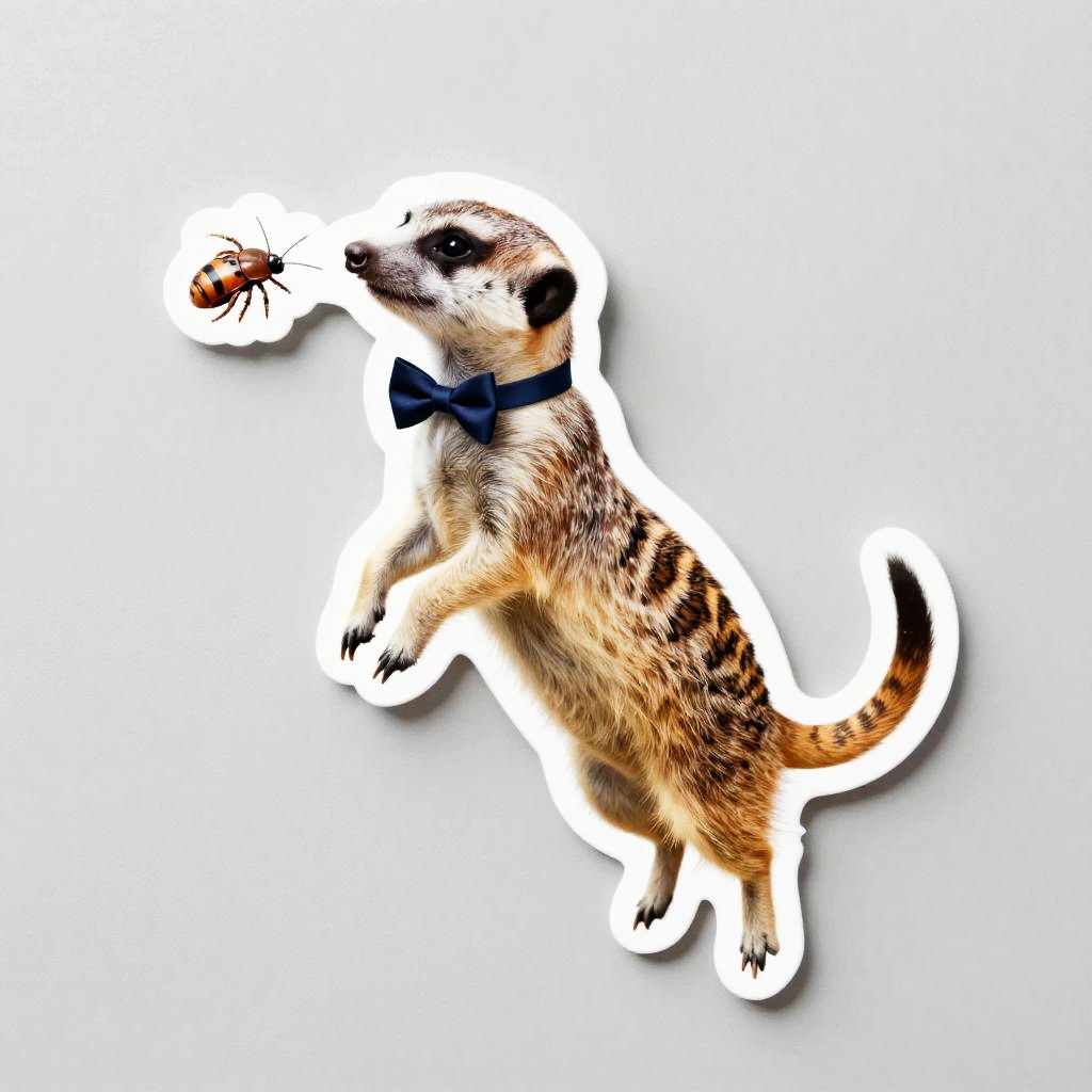 Die cut sticker of a meerkat leaping to catch a bug wearing a bowtie