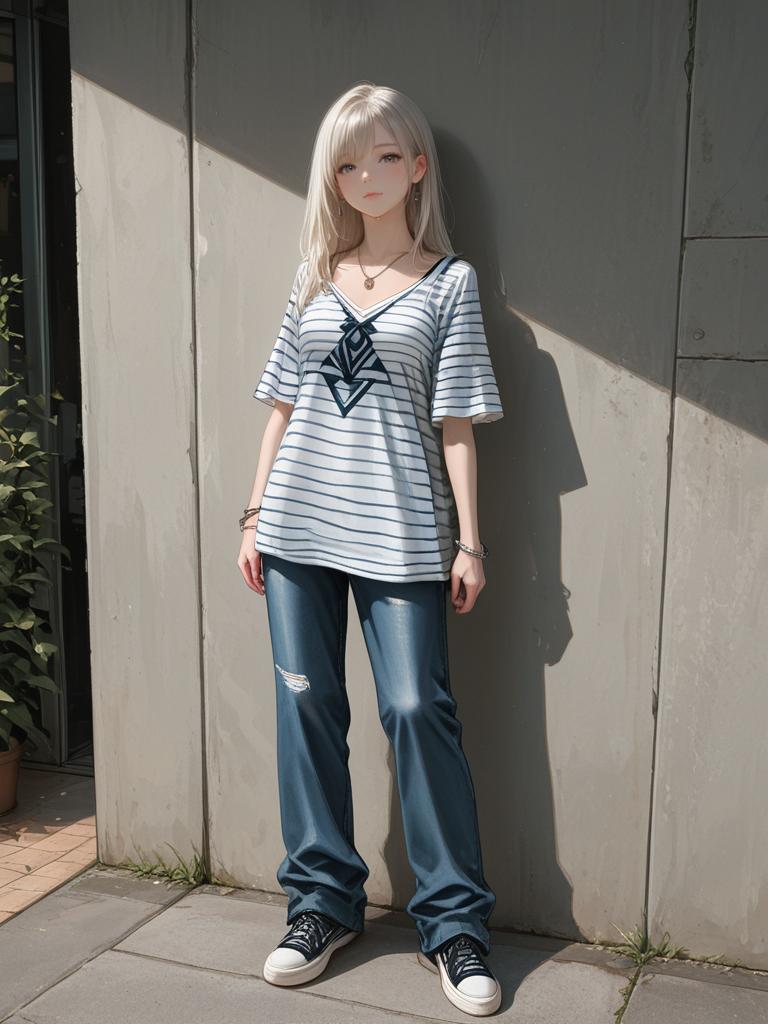 1girl, realistic face, full body shot, Woman, casual chic, white graphic t-shirt with blue print, tucked into high-waisted black skinny jeans, narrow belt with silver buckle, ankle boots with snakeskin print, pointed toes, photo studio background.