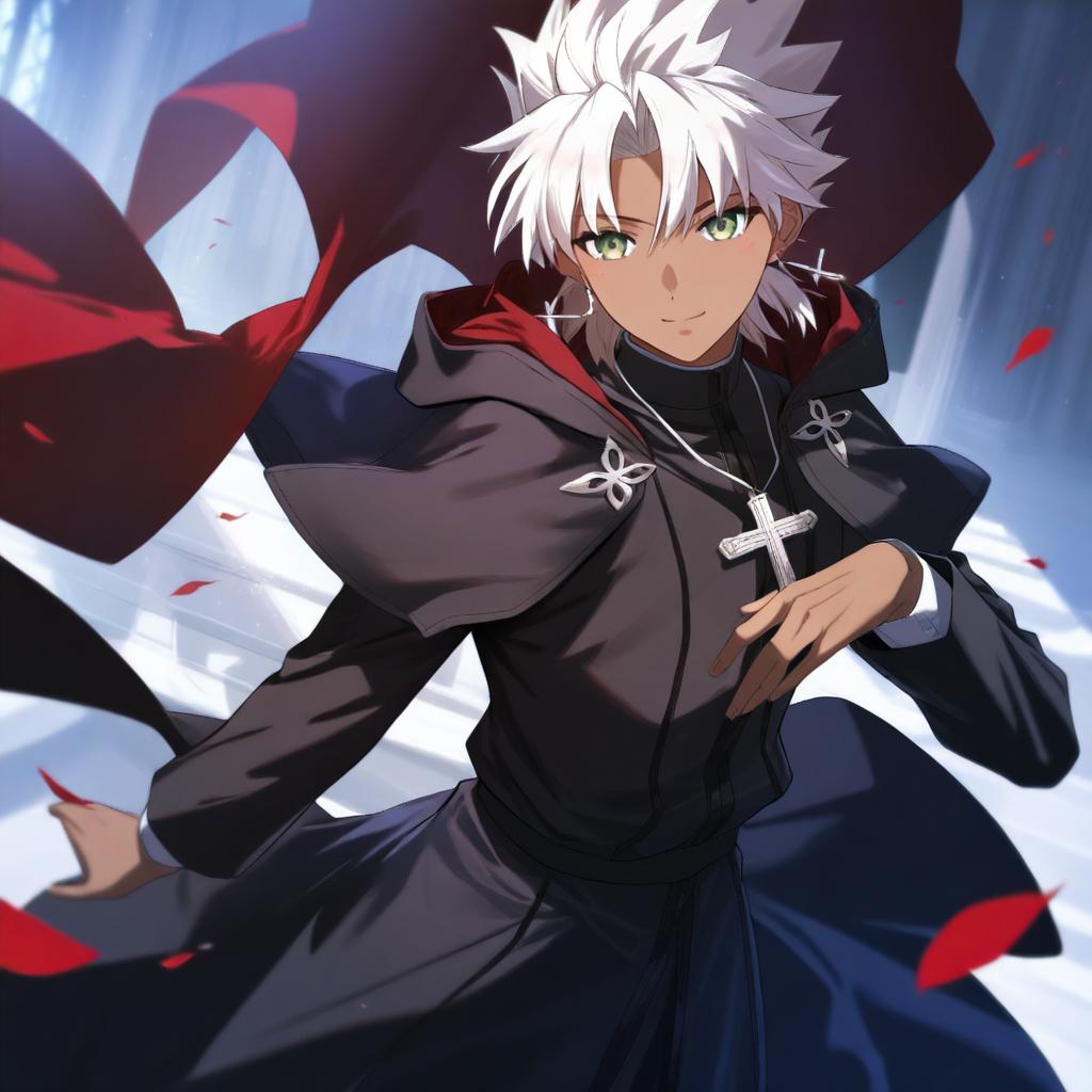 Amakusa shirou (fate), fate (series), 1boy, dark-skinned male, yellow eyes, brown eyes, white hair, short hair, parted bangs, long sleeves, earrings, cross necklace, priest, by artist ipuu (el-ane koubou), animagine