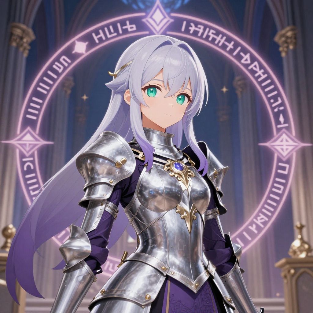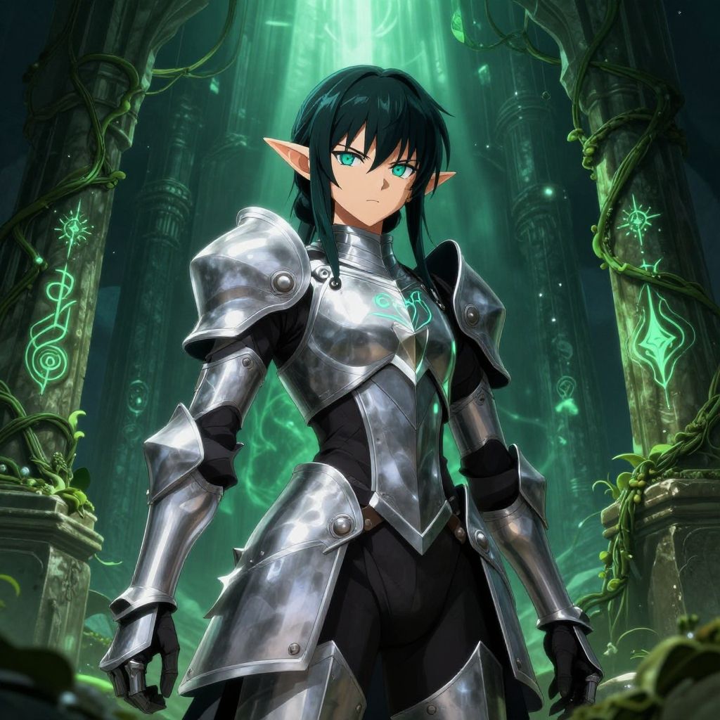 Anime elf base warrior in ancient ruins, sharp elegant armor, piercing gaze, lush green vines and magical runes, dramatic lighting, highly detailed character art