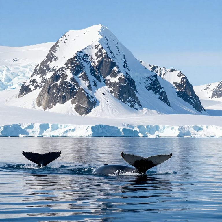 Photograph of a serene Arctic scene featuring two whale tails breaking the surface of calm, reflective blue water in the foreground. In the background, a towering, snow-capped mountain with rugged, dark rocky peaks rises against a clear, bright blue sky. Flanking the mountain are smaller icebergs, adding to the cold, pristine landscape. The image captures the stark contrast between the dark, sleek whale tails and the bright white snow, highlighting the natural beauty and tranquility of the Arctic environment.