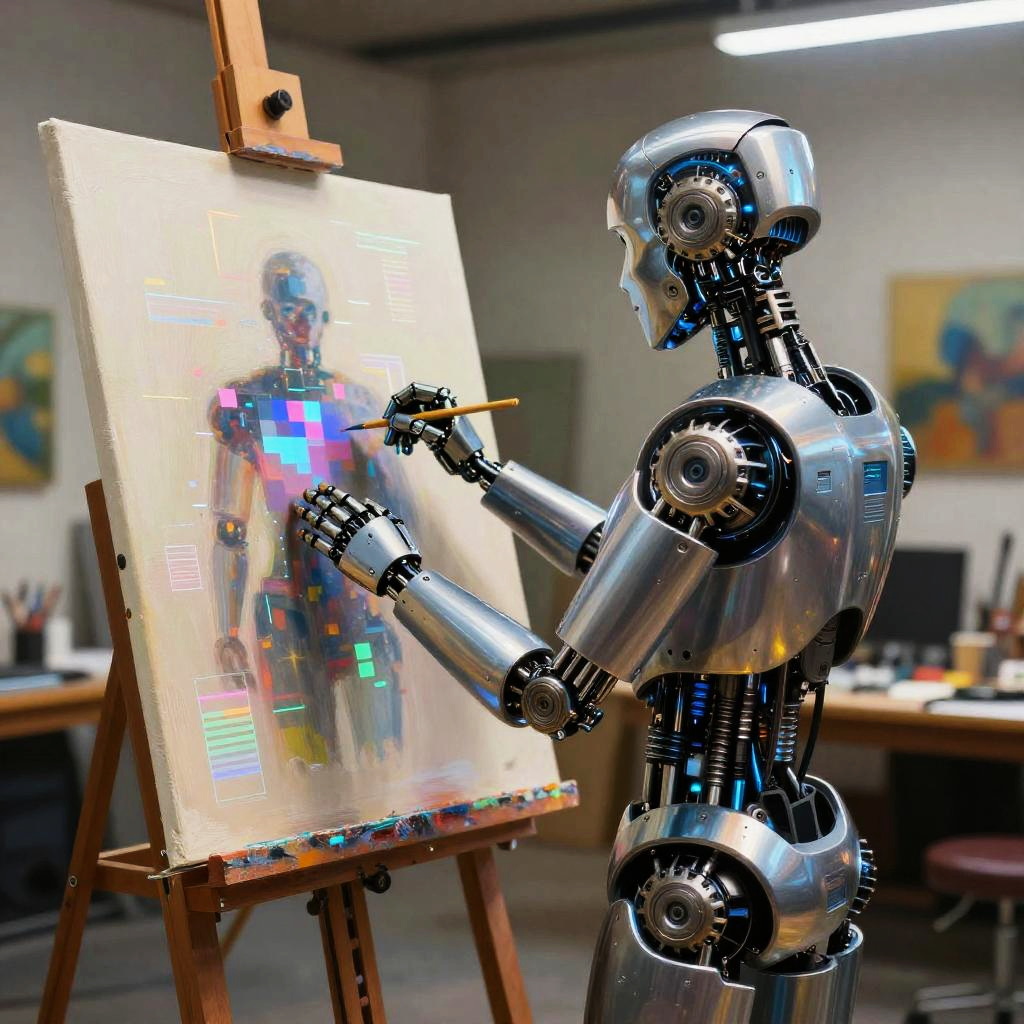 Ai art painting portraying a robotic artist at work in a studio with holographic canvases, combining expressive brushstrokes and pixelated effects, a harmonious mix of cold metallic textures and warm artistic ambiance, richly detailed and atmospheric
