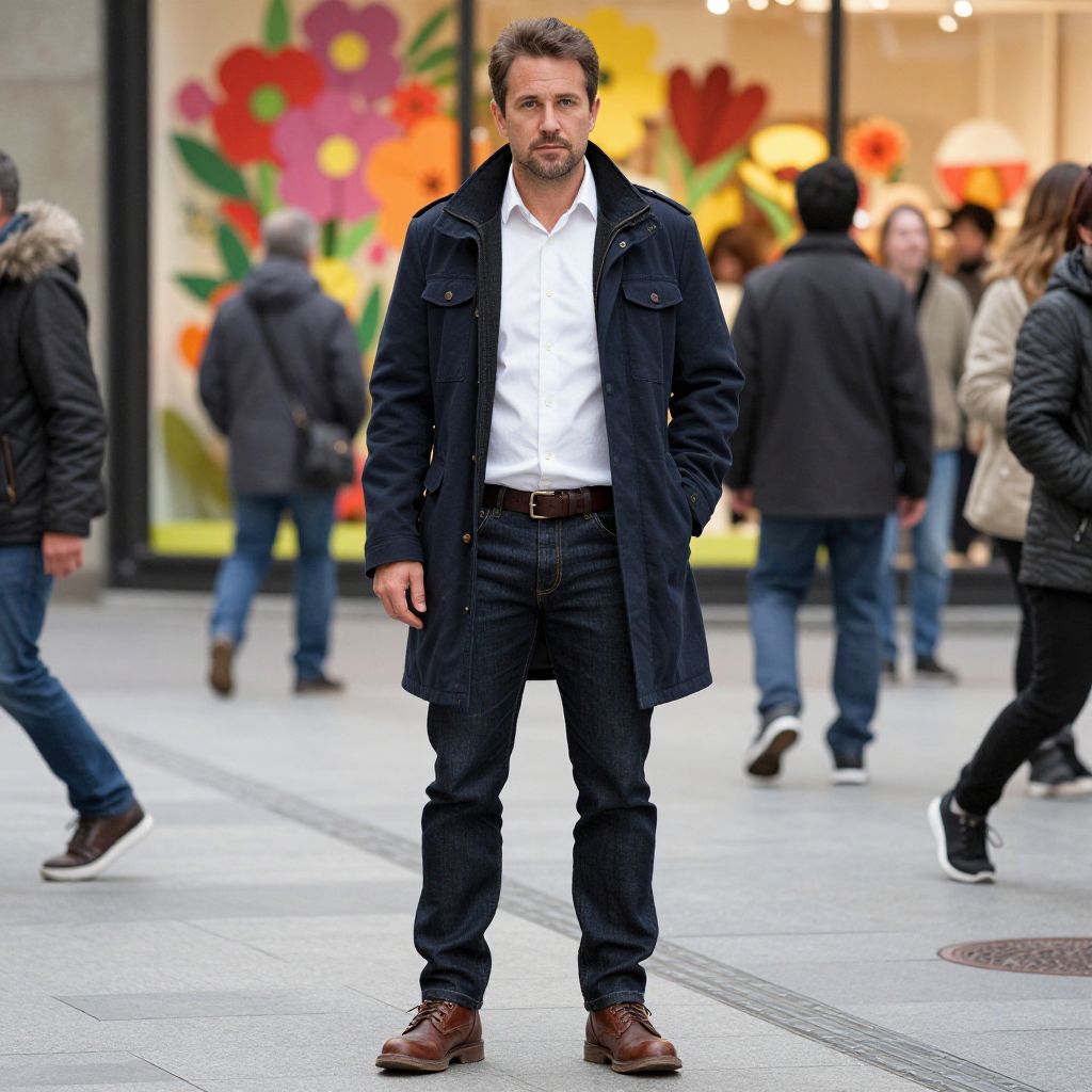 "a man, urban explorer peacoat, crisp white button-up, dark wash slim-fit jeans, rugged brown leather boots, casual leather belt, bustling shoppers, vibrant seasonal displays, lithographic film style, confident expression Man has masculine face and piercing eyes"